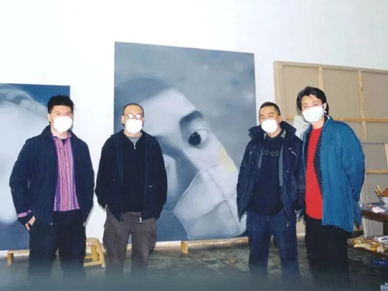 ▲ SARS期间,程昕东与俸正杰、张晓刚、曾浩在张晓刚北京工作室,2003