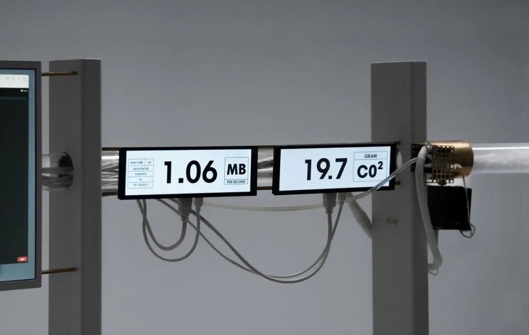 装置展示了电力使用和数据中心热量所产生的影响,我们每使用 1MB 会产生大约20克二氧化碳。揭示隐藏的影响,并表明我们必须转向可持续的数据使用。