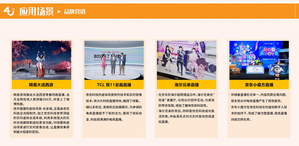 世优科技核心技术为实时虚拟数字人技术和虚拟演播室技术,深耕虚拟技术领域十余年,致力于打造数字人工厂,以实用化和低成本化技术和服务,为企业和品牌提供定制虚拟数字人IP、虚拟场景、特效展现等多元化创意的虚拟技术营销方式,能够满足企业线上虚拟发布会、线上虚拟直播等对内对外的线上虚拟活动和虚拟节目场景制作需求。