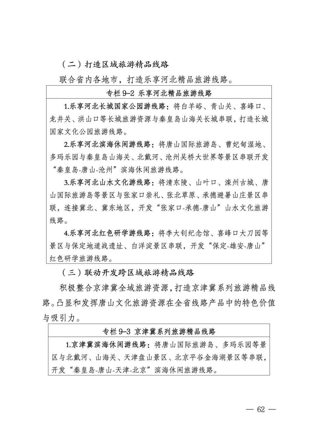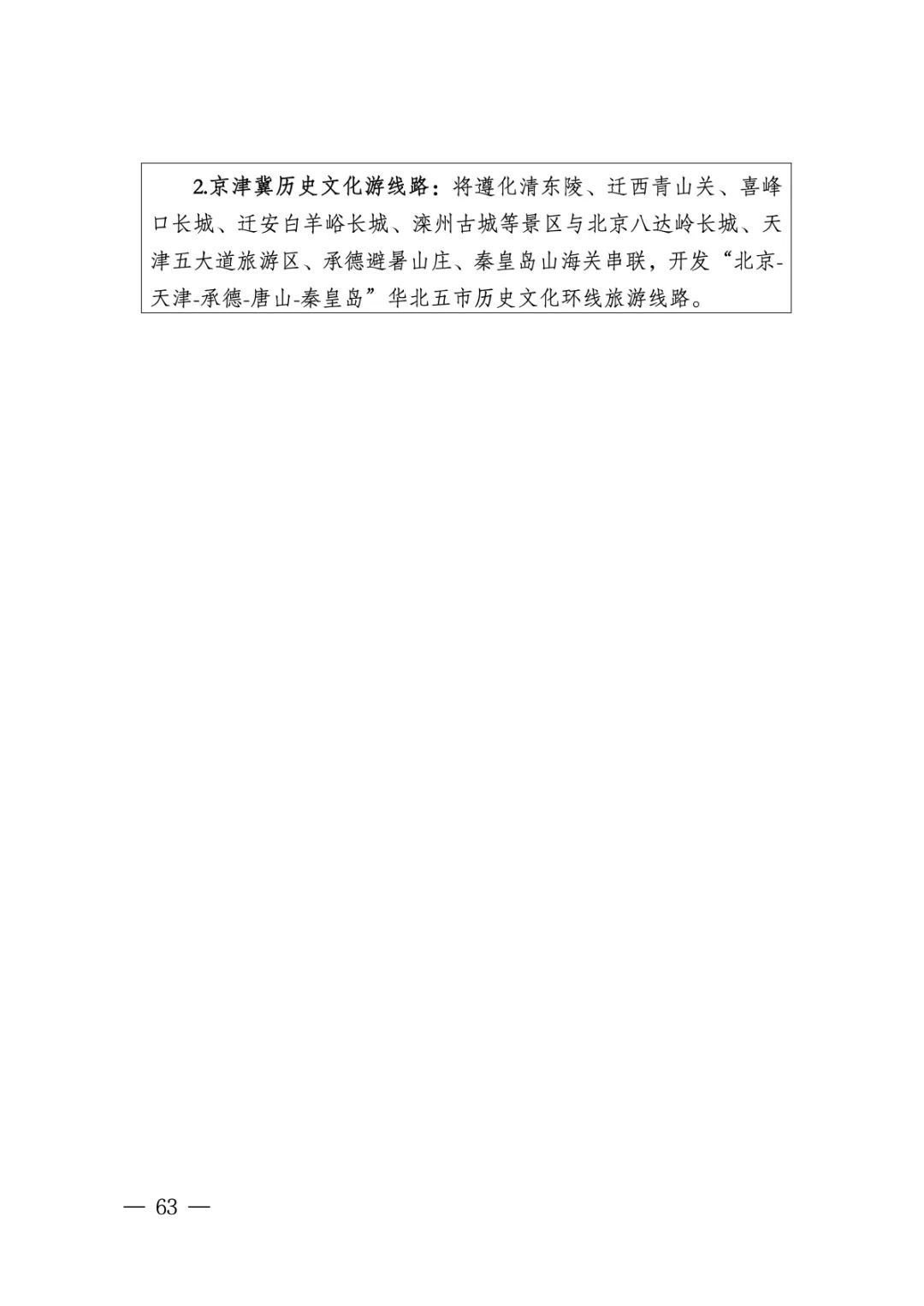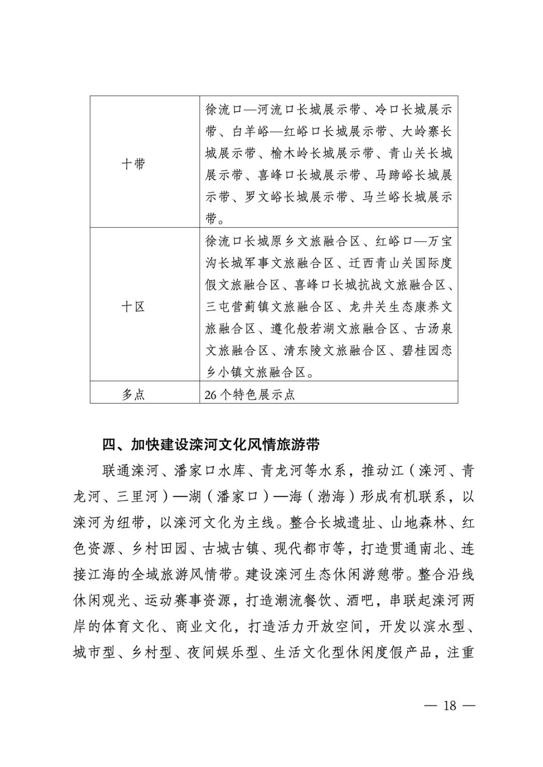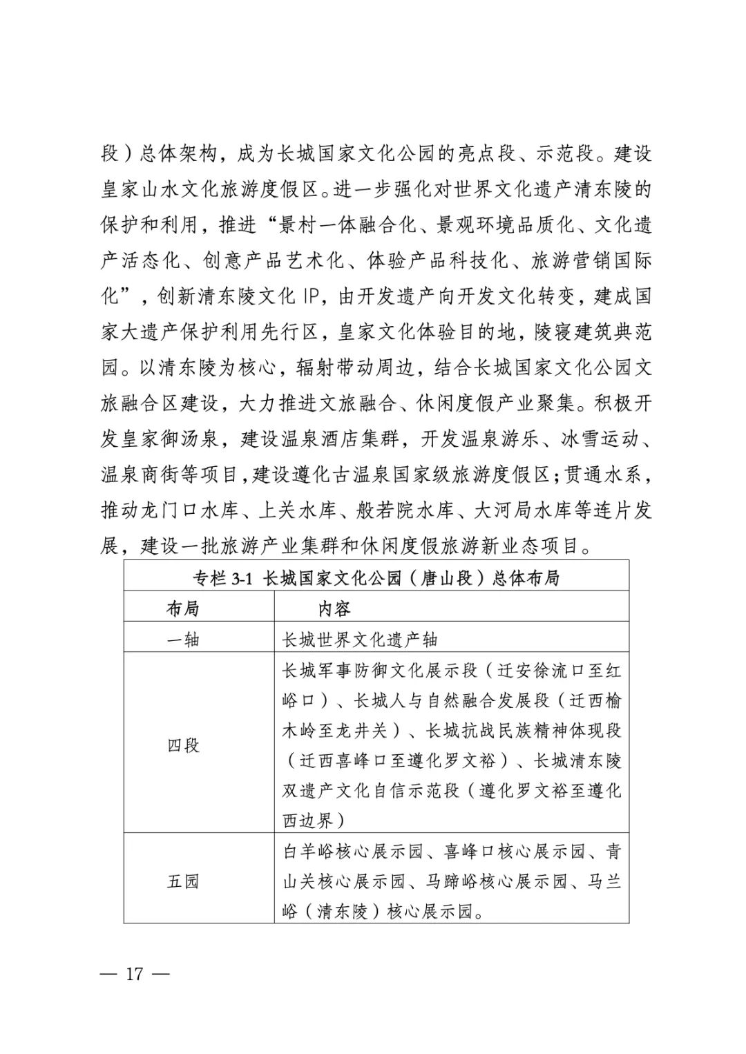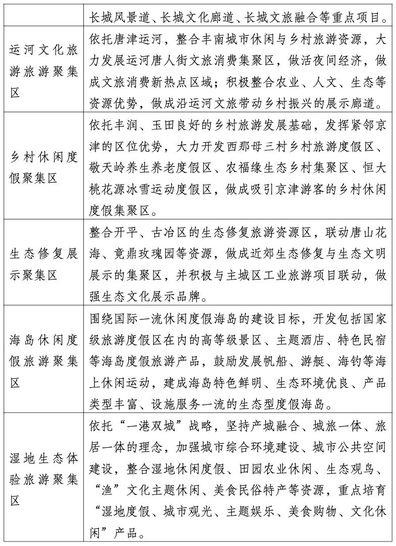 建设皇家山水旅游聚集区、长城文化旅游聚集区、运河文化旅游旅游聚集区、乡村休闲度假聚集区、生态修复展示聚集区、海岛休闲度假旅游聚集区、湿地生态体验旅游聚集区等七大文旅集聚区。