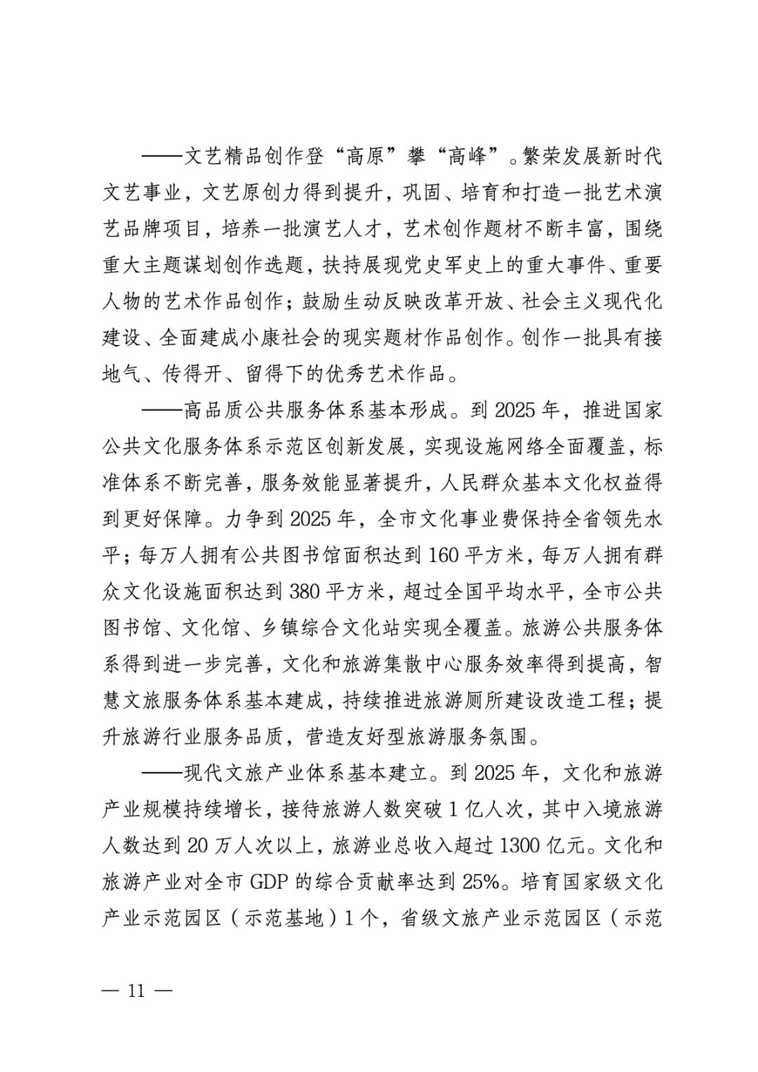 到2025年,文化和旅游产业规模持续增长,接待旅游人数突破1亿人次,其中入境旅游人数达到20万人次以上,旅游业总收入超过1300亿元。文化和旅游产业对全市GDP的综合贡献率达到 25%。培育国家级文化产业示范园区(示范基地)1个,省级文旅产业示范园区(示范基地)5 个,全力提高文化产业经济效益、社会效益。优化旅游产业增量,带动提升增量,形成以精品景区(度假区)为带动、龙头景区(度假区)为支撑、3A级以上景区为基础的富有活力和竞争力的旅游产品体系。多元化景区(吸引物)并存的旅游吸引物体系更加完善,现代旅游企业制度进一步确立,竞争力显著增强,基本建立起和现代旅游需求相适应的现代旅游产业体系。国家级旅游度假区实现零的突破,省级旅游度假区达到2-3家,国家5A级旅游景区达2-3家,4A级景区达到20-22家,3A 级旅游景区达到35-40家。