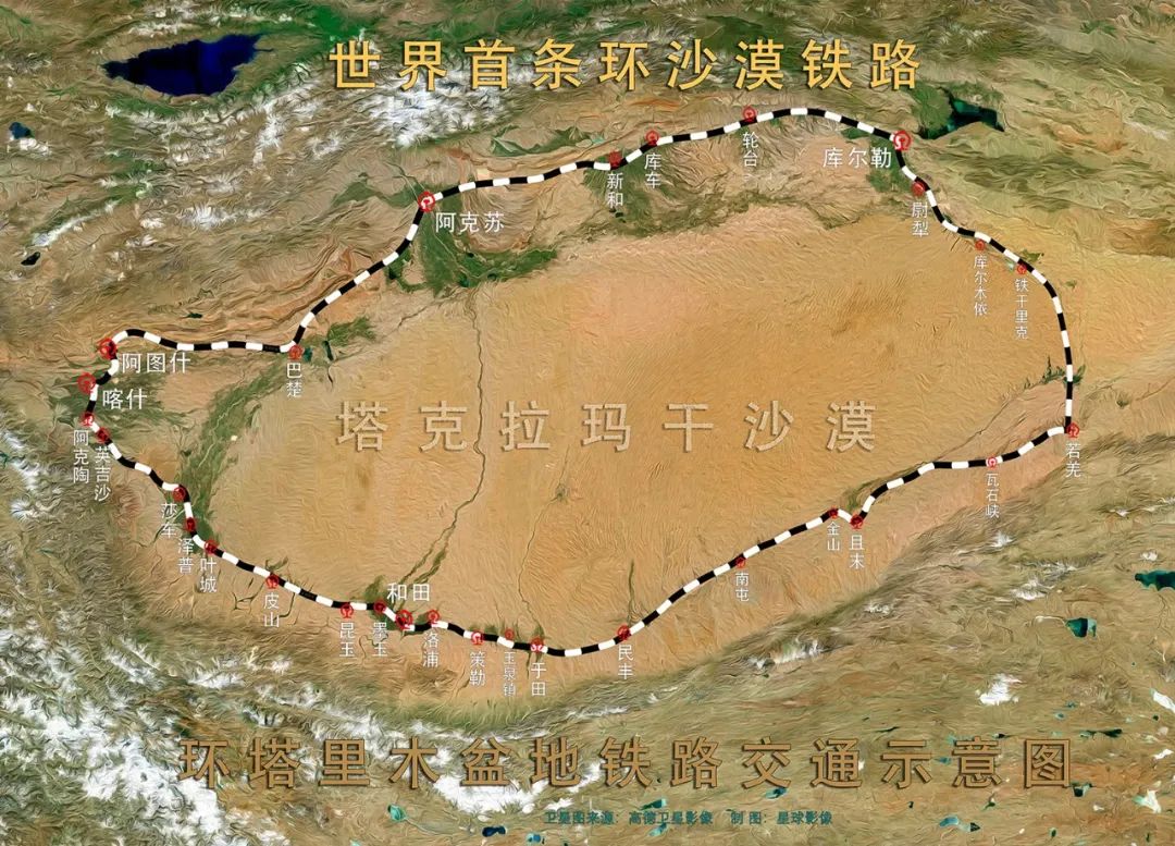 ▼ 世界首条沙漠铁路环线闭环通车,全长2712公里的环塔火车线路示意图