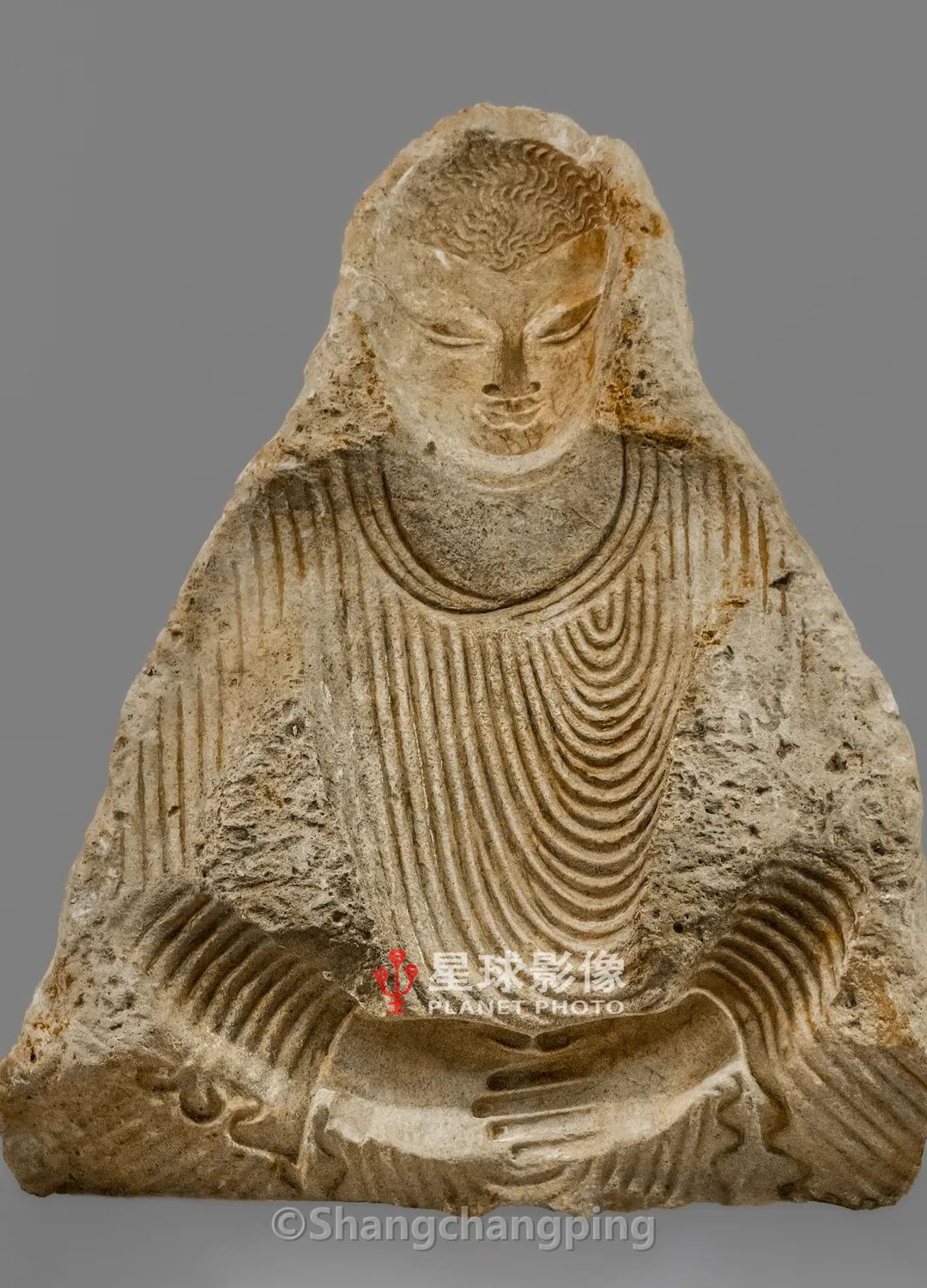 ▼ 于田县吉格得库杜克遗址出土的一尊坐佛石膏范,年代:北朝。这是用于制作石膏佛像的范,佛像作趺坐像,双目微闭,面目慈和;佛衣薄透,衣纹细密