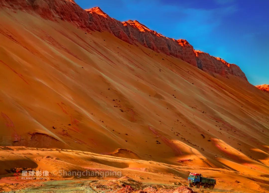 ▼ 一辆货运汽车穿行在塔克拉玛干沙漠腹心地带