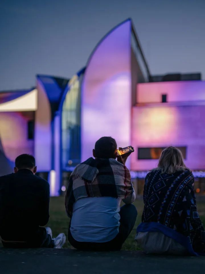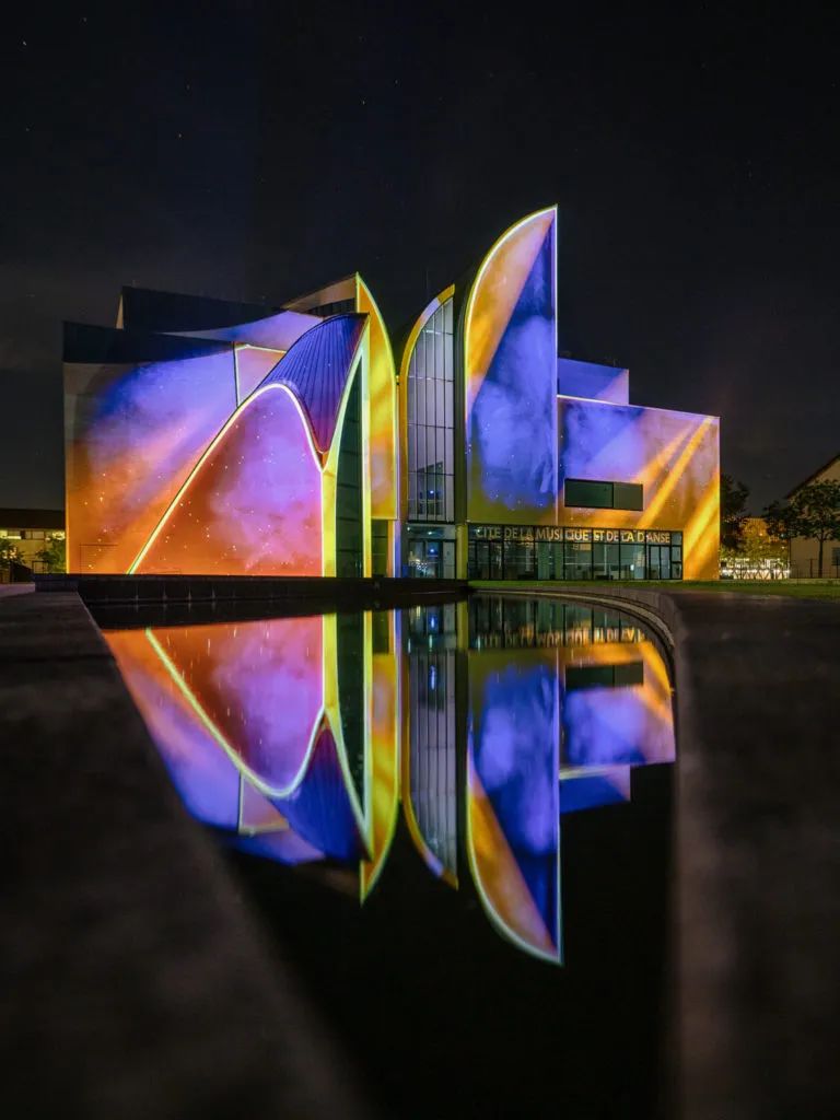 白天的音乐厅显得内敛而安静,似乎像是暴风雨前的宁静。当夜幕降临时,音乐厅突然爆发出炫彩的光影。