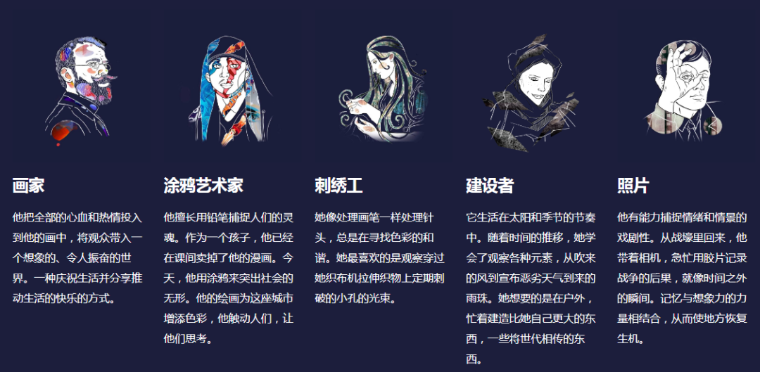 画家、涂鸦艺术家、刺绣工、建筑工人和摄影师