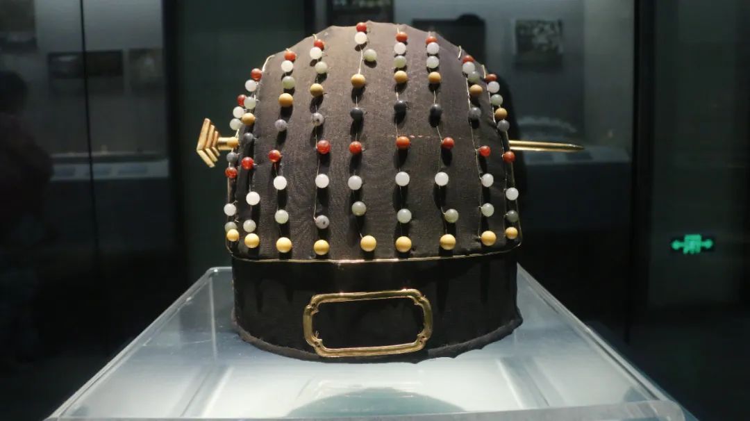 冕冠的綖(冠顶板)板和冠卷(冠周沿)已朽,存140件金玉附件。文献记载,新王冕冠五采玉珠,九放旒。今据山东鲁荒王冕冠复原。
