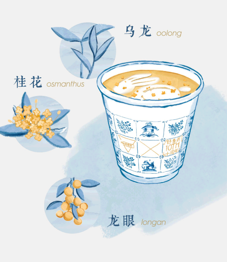 得益于第一次的成功合作,野兽派在十周年之际再度携手Manner,以桂花乌龙香氛为灵感推出桂花拿铁升级版“青花瓷拿铁”。整个杯面设计将桂花、乌龙树叶设为蓝色,花朵为金色,均匀放置在蓝色“井”格中,“蓝云笼晓,玉树悬秋”中金色桂花点缀秋色的朦胧美感瞬间转化为了大众直观的视觉感知。为味觉上馥郁桂花香配合回甘乌龙,桂花乌龙香的氛围与情调,再次通过Manner的产品风味传递给了大众。