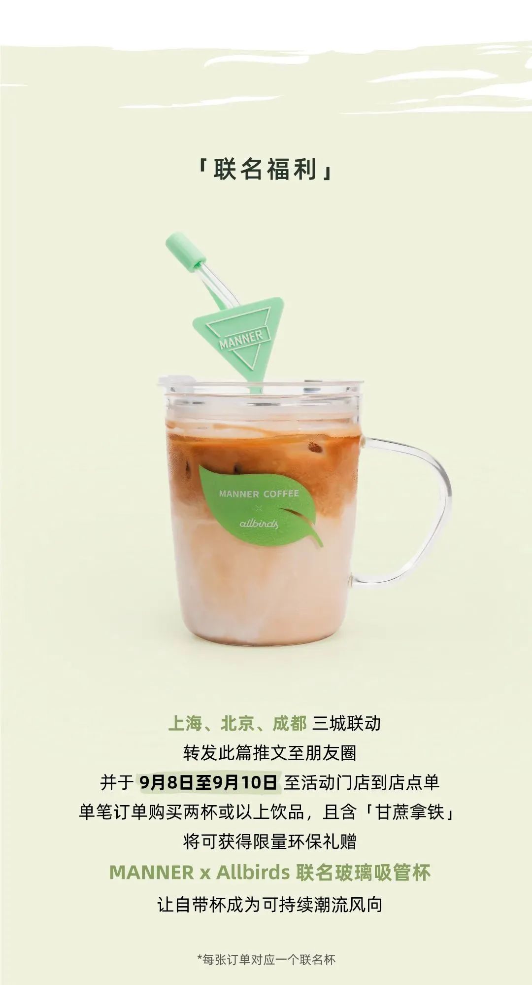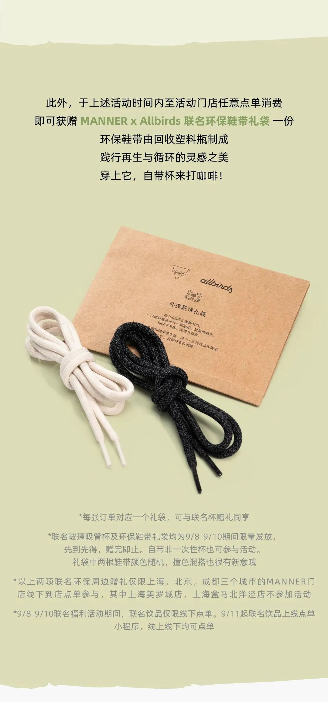 除了蔚来,近年因“可持续创新”概念大火的运动品牌Allbirds也是Manner的联名对象。去年,两大品牌携手推出了“甘蔗拿铁”,饮品灵感来源于Allbirds从甘蔗中提炼的SweetFoam[绿科技]材质。与此同时,这次联名还推出两大环保周边:玻璃吸管杯和环保鞋带礼袋。