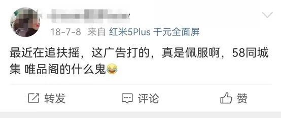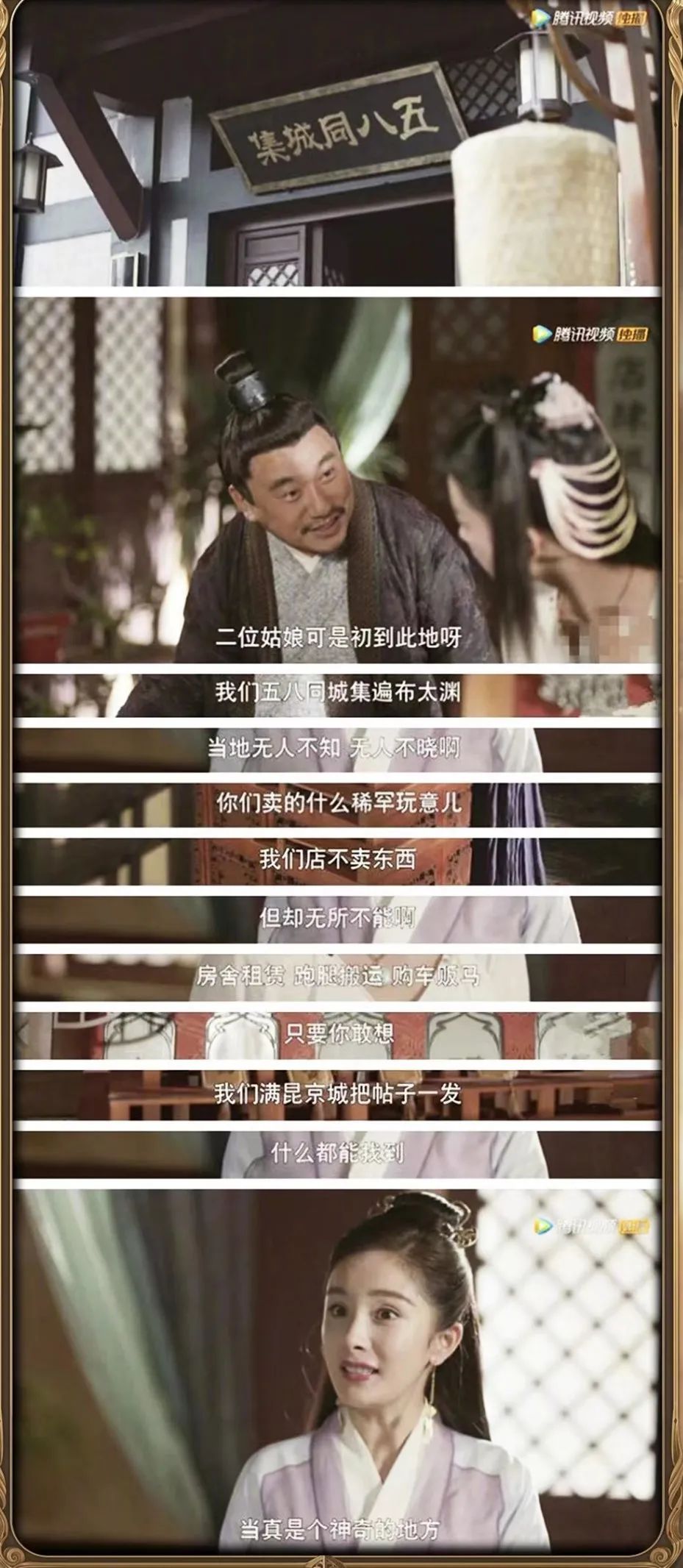 无独有偶,现代信息类网站58同城在《青云志》里变成了古代的“安保公司”——58同城镖局,品牌logo飘满屏幕。在《扶摇》里它还分身成了遍布京都的神店——五八同城集,房舍租赁、跑腿搬运、购车贩马,无所不能,直接将现代服务进行了时空平移,连主角都要惊叹一句:当真是个神奇的地方。