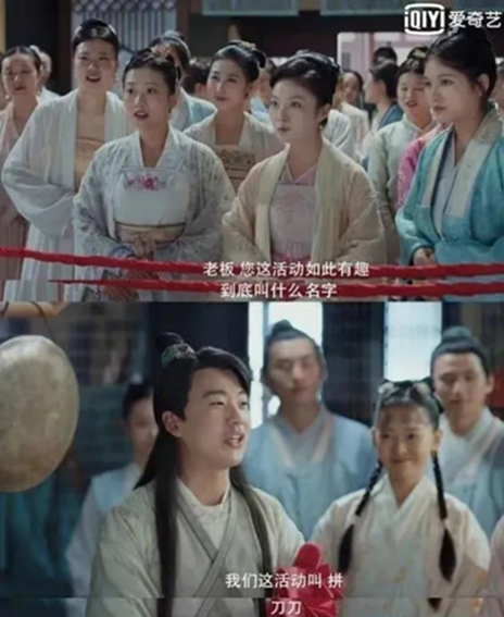 古装剧《赘婿》中穿越回古代的主角宁毅将现代经商思维嫁接到古代商业文化上。在新店开业之际,发明了一套新型购物方式——拼刀刀,通过将剪刀投掷转盘的方式,获得购物折扣,同时也可以让朋友帮忙砍价。这熟悉的套路很难不让人联想到它的现代实体——拼多多。试问当年有多少人没能逃过“帮我砍一刀”的魔咒。