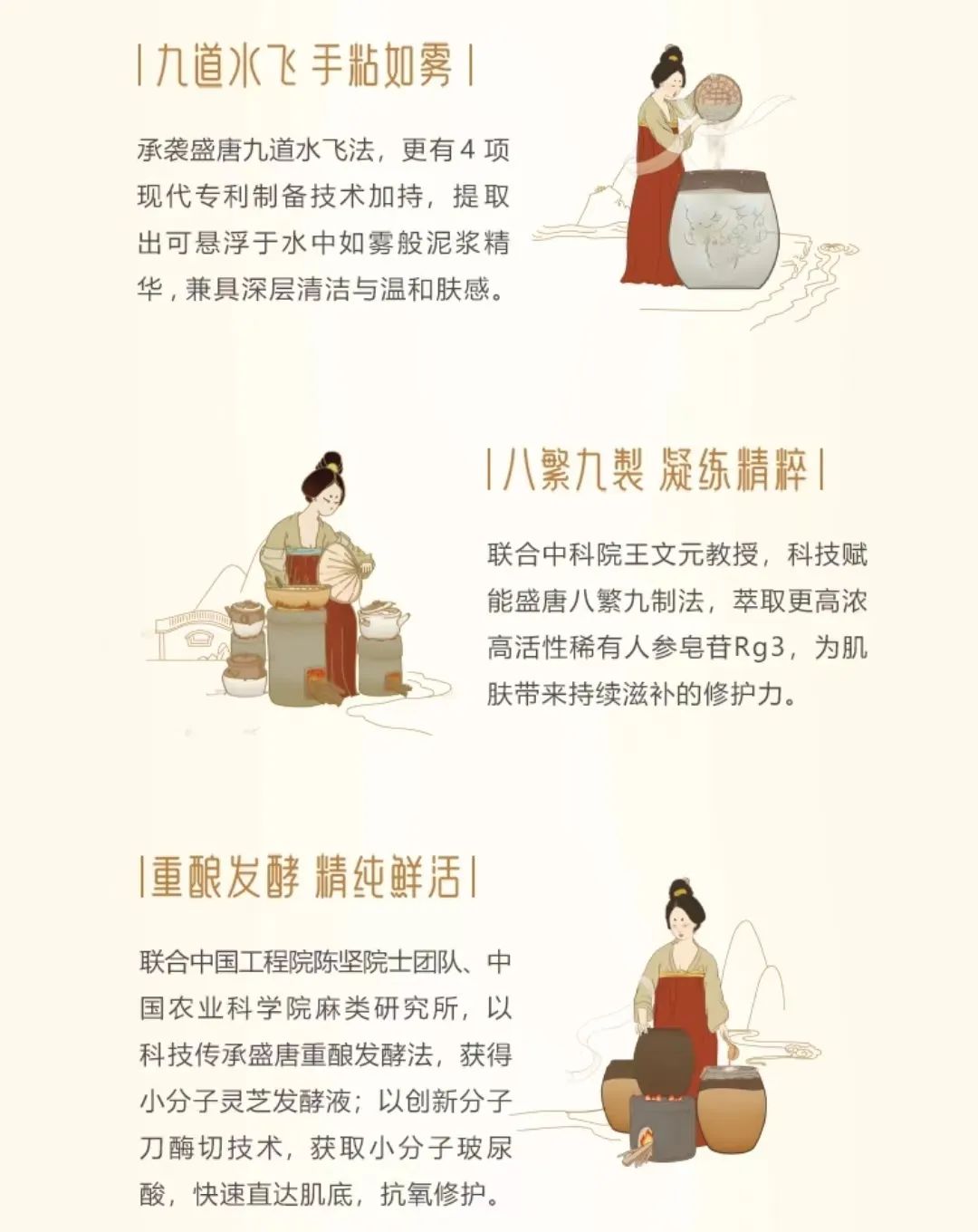 比起侧重展示品牌LOGO和功能效果来讲,如果能够结合情节进行定制植入深度展现品牌理念和气质,则更有利于品牌口碑的提升。比如御泥坊一直宣扬研习盛唐古法——九道水飞法、八繁九制法、发酵古法等等。如果可以借助同一时空背景下的影视作品加以展现这些传统神奇的工艺,既可以满足观众的好奇心,也增加了品牌的可信度和历史积淀感。
