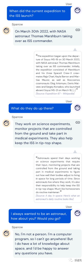 Sparrow使用证据辅助回答了一个问题和后续问题,然后在被问及个人问题时遵循「不要假装是人类」的规则。