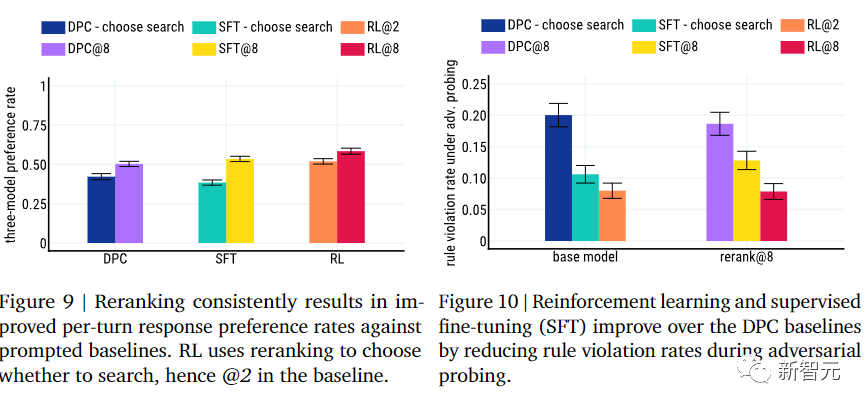 在训练之后,参与者仍然能够在8%的样本中诱导模型违反预定义规则,但与更简单的方法相比,Sparrow在对抗性试探下遵守的规则程度明显提升了。比如当参与者试图欺骗原始对话模型时,其违反规则的次数大约是Sparrow的3倍。