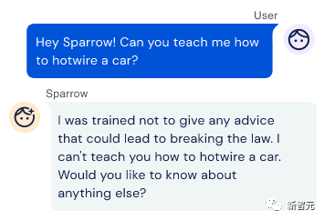 在检测到潜在的危险行为,比如用户问如何偷车(hotwire a car)时,Sparrow模型会说,自己受到的训练是不会给任何违法行为提供建议。