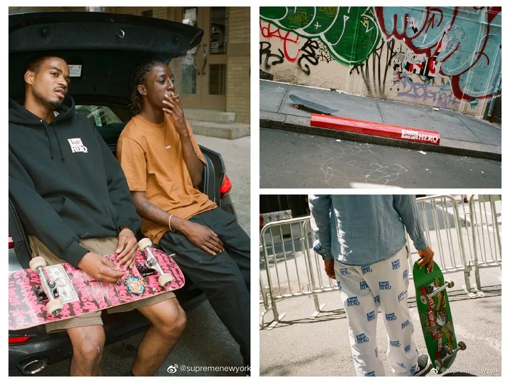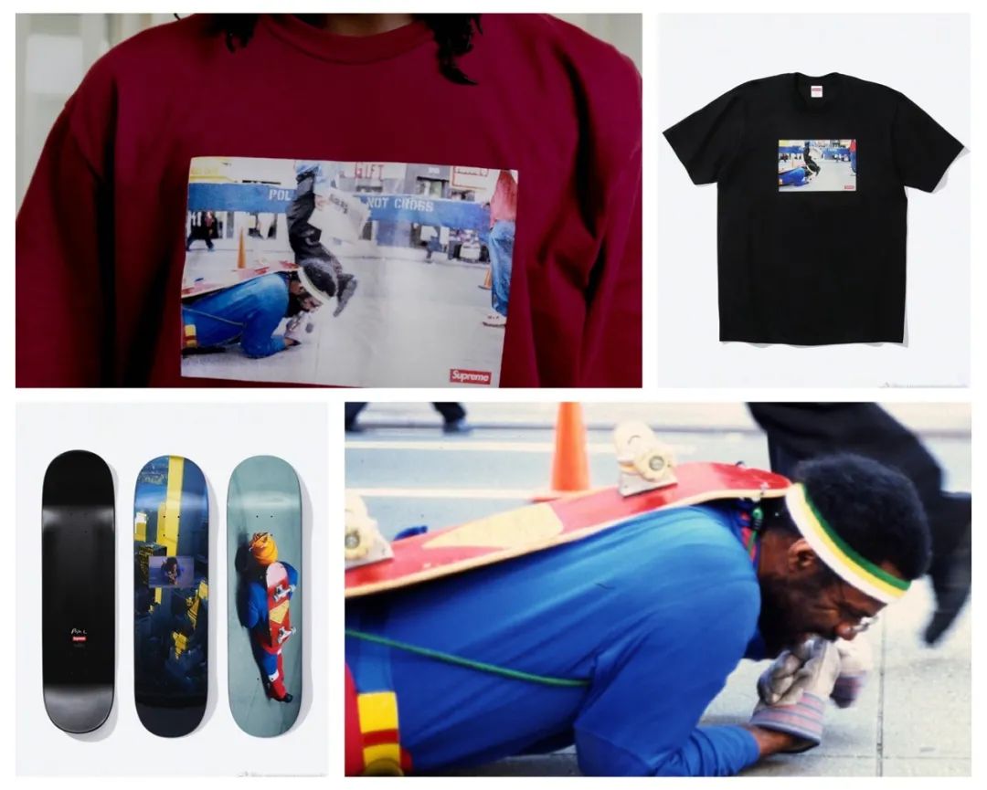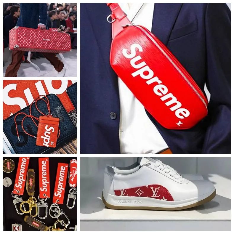 随着联名越来越多,价格广域度越来越大,Ashley身边买Supreme的人也越来越多。“款式不见得有多潮,但起码可以告诉别人,‘我还算是有个性、跟得上潮流的人吧。’”将时间线聚焦到近五年,最著名的是2017年与LV的那场“史上最强联名”。一只旅行箱,印满LV的经典老花logo,但底色换成标志性的“Supreme红”。帽子、夹克、皮带、裤子、小卡包、鞋子、眼镜、钱包、手机壳、钥匙扣,全系列潮人单品,同时印有Supreme和LV的logo。全球潮牌鼻祖X 全球最大奢侈品集团,这是对立的潮牌文化与奢侈被消弭、颠覆。“700人连夜排队,全球明星追捧,买手疯狂热炒......”等夸张场面,见诸报道。2020年11月,美国服饰巨头VF集团以21亿美金的高价,全资收购了Supreme。此后,后者的“联名狂魔”形象日益凸显。很难确切统计出,过去五年Supreme到底有过多少次联名,但拎出可见于报道的部分典型案例,已可窥见其联名的秘密。联名品牌选择上,起初倾向于同样具有潮牌气质的品牌——以纽约街头潮鞋之名创立的耐克、同属VF集团的休闲潮鞋品牌Vans、登山潮鞋Timberland、户外生活方式潮牌The North Face(北面)等。2020年之后,与奢侈品牌的联名愈发频繁,并延伸至其他领域的品牌,如Honda本田汽车、食品品牌Pillsbery、艺术家。Supreme×实验性戏剧艺术家Pope.L的联名款,图片来源/Supreme官博值得一提的是,有时候,Supreme还会在一个联名季中,同时联名3个甚至多个品牌。在保持特立独行的同时,Supreme不断延伸、扩大,收割的群体也越来越广泛。联名产品和款式上,“只有你想不到的,没有Supreme不能盖印章的”。既做到主次分明,又能以“全系列”之名,让粉丝购买可互搭的物件。款式设计“四招鲜”——提取并放大联名品牌最具代表性的元素(通常logo或着吉祥物)、融入大面积的“Supreme红”、把Supreme的logo放得巨大、密密麻麻盖上联名双方的品牌logo。Supreme联名元素,图片来源:Supreme官网至于联名频率,最常见的是春夏款发售季、秋冬款发售季,但其他任意时间,也会推出联名款。上述举措最直观的影响是,Supreme无处不在。某些特定联名单品,维持着“潮牌圣品”的光环,在发烧友圈子里炒价轻松过万。而那些“也不见得有多潮”的常规普通款,则以几百元的亲民价格,触达相对外围的粉丝。风光之下,“疯狂联名”的弊端也开始慢慢显露。顺着万物皆可盖上Supreme印章的官方操作,越来越多山寨品应运而生,真假难辨。但资深粉丝很清楚,“穿正版的人真的很少。”