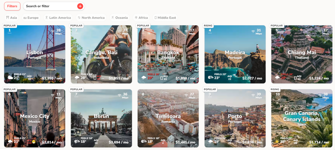 根据全球城市评分网站(Nomad List)实时更新的数字游民榜单统计,最受欢迎的数字游民目的地前十包括里斯本、仓谷、曼谷、马德拉群岛、清迈、墨西哥、柏林、蒂米什瓦拉、波尔图、加那利群岛。