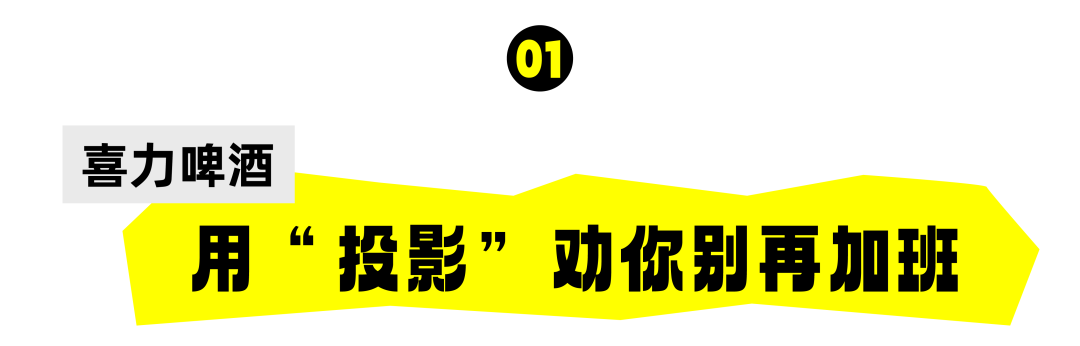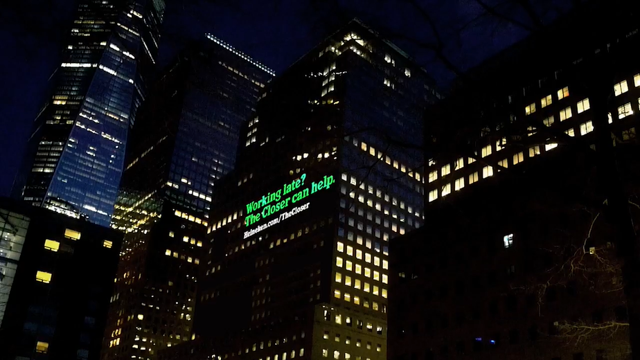 与“黑科技”开瓶器产品配套,喜力啤酒还在晚上九点以后的纽约街头,用投影出来的绿色大字提醒身在其中的加班打工人该下班了。