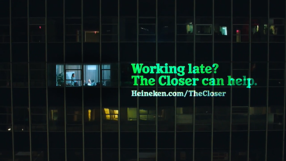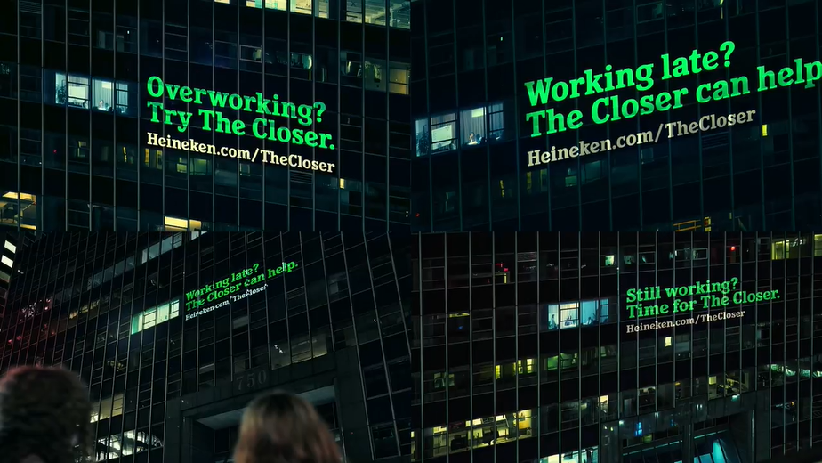 “Working Late?The Closer can help”(工作到很晚?the closer可以给你帮助)和“Still working?Time for The closer”(还在工作?该腾出时间给the closer了)的投影文案,大胆又创意,想必附近办公楼的加班族看完对下班的渴望又多了几分。