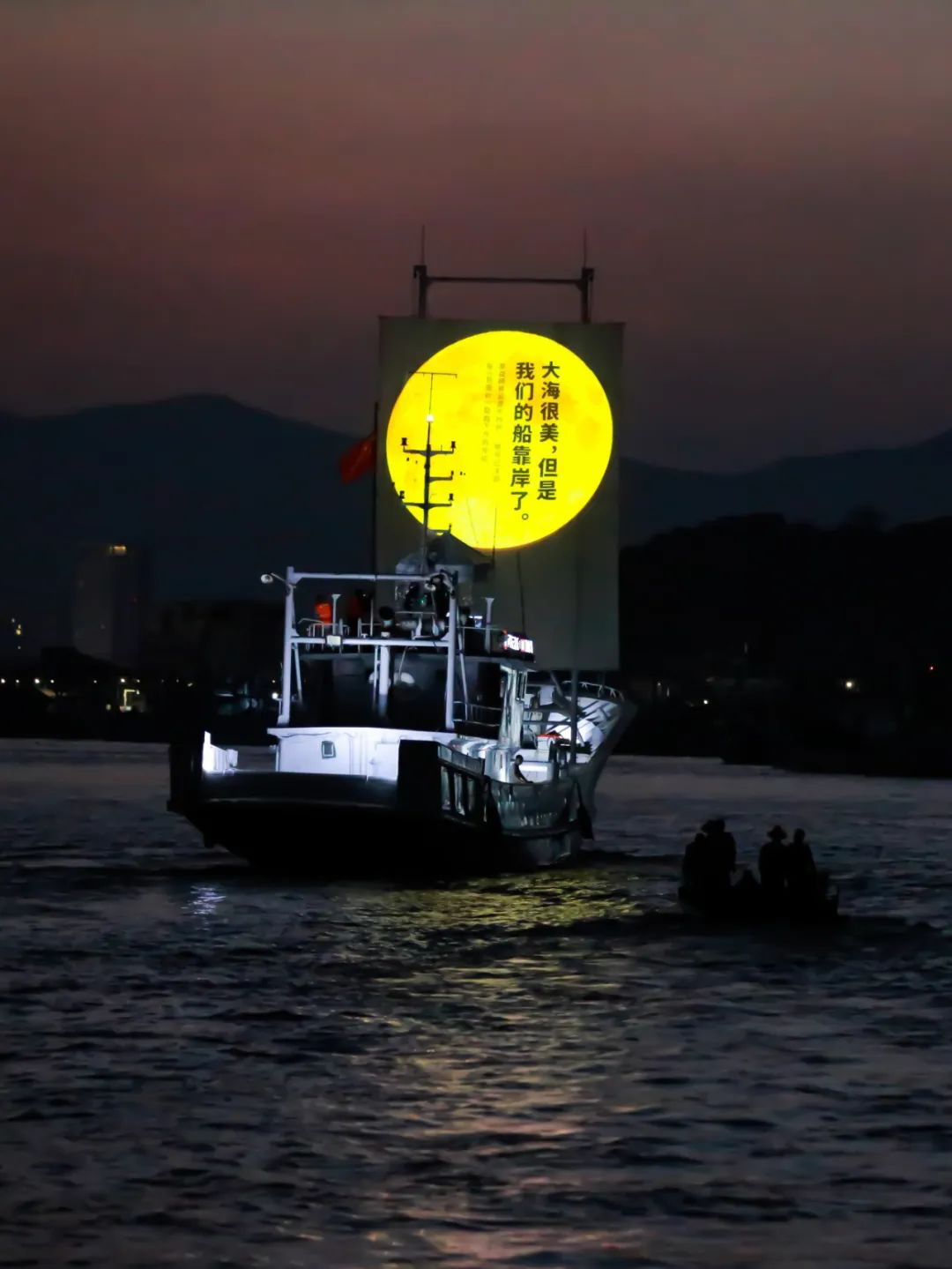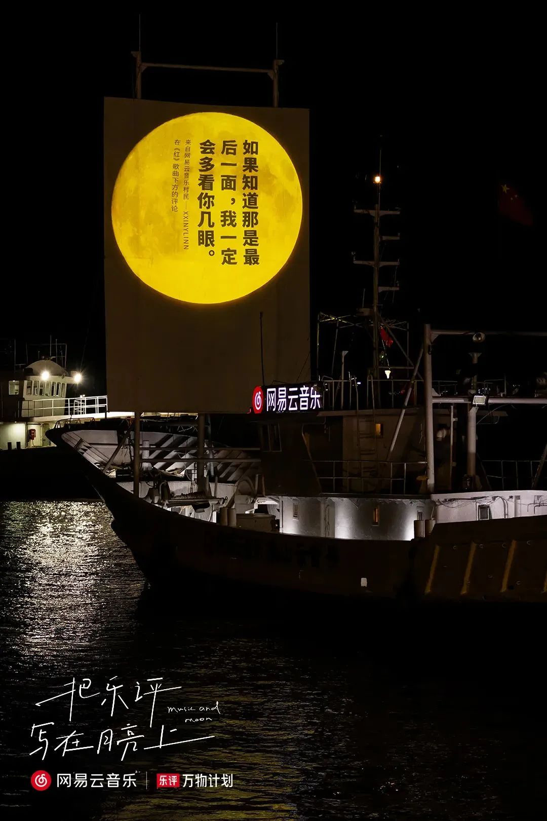 简单概括就是,网易云音乐在宁波象山的海边承包了一艘轮船,然后用投影在帆布上面,手动“升”起了一轮圆月,并把社区内那些关于「遗憾」的乐评,打在了这轮圆月之上。