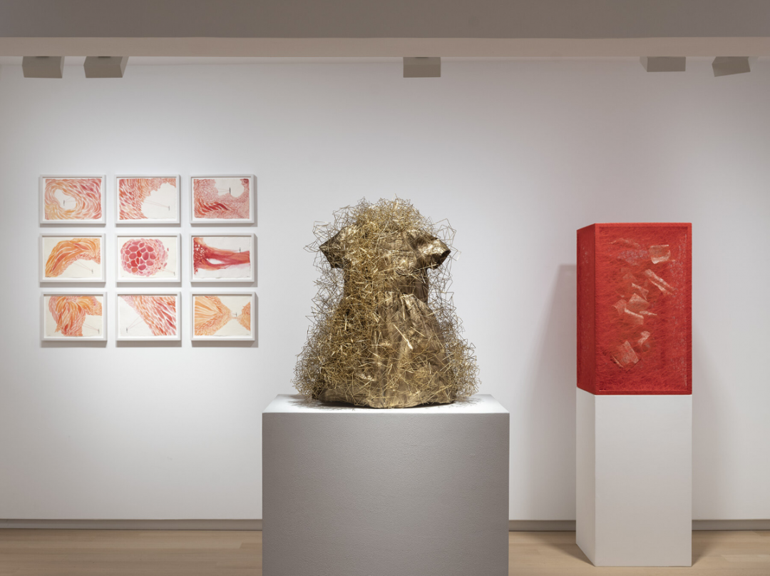 在大型装置之后,Galerie Templon展示了许多雕塑,这些雕塑展示了Chiharu Shiota在各种规模上的作品。悬挂在盘绕的线中,日常事物浮现,仿佛凝固在时间里。“我觉得我们拥有的物品就像第三层皮肤,”她继续说道。“我们积累了这些东西,并将我们的存在感和记忆转化为它们。“这些物品往往已经过时,充满了不为人知的历史,比如破旧的行李箱、沾满污渍的洋娃娃、微型家具和小瓶子,它们展示了回忆的礼物,这些礼物只能看,不能摸。”