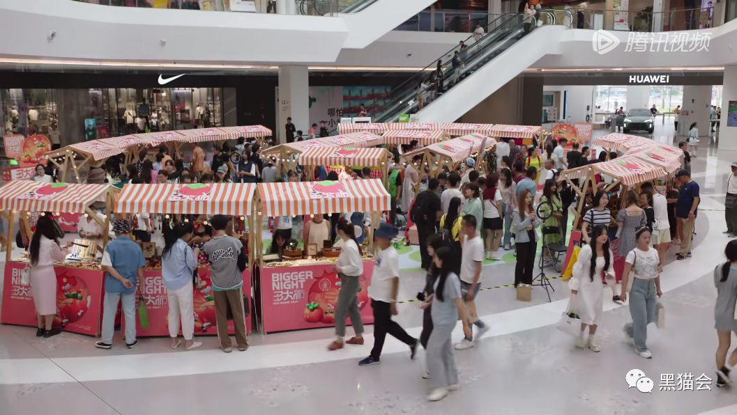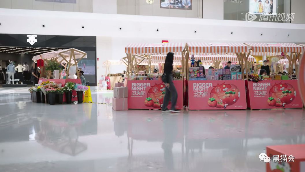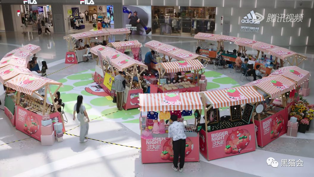 在购物商场里的小市集,把户外的夜市市集换个模式搬到商场里边,用有趣的小玩意、还有特色的餐饮吸引消费者的到来,增加他们在商场的逗留时间,引发他们的消费热情。