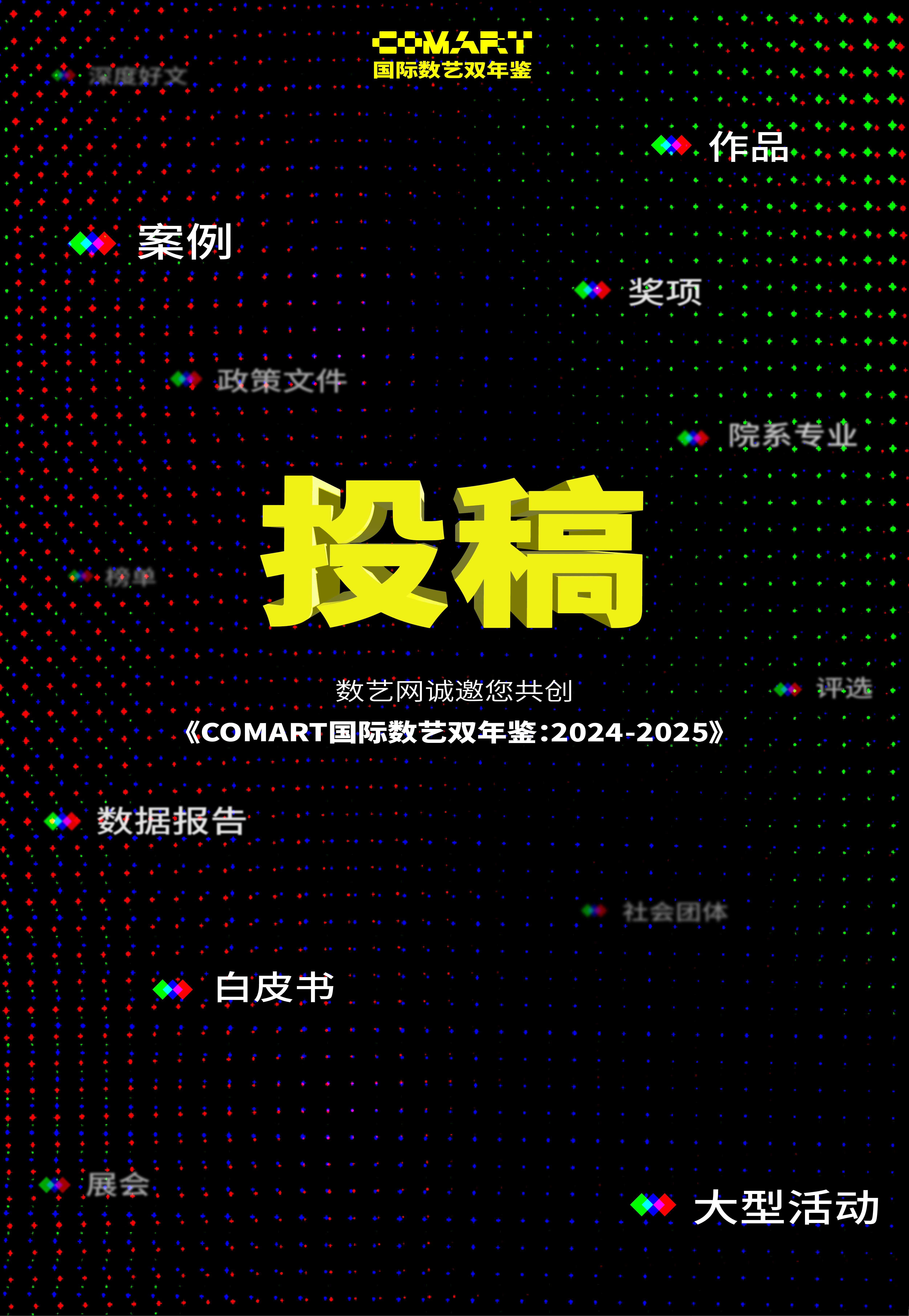 在此,我们诚挚地邀请大家成为 “共创者” 加入。无论您是身处数字艺术产业上下游的企事业机构及创作团队,还是与数字艺术产业紧密关联的行业媒体及平台,亦或是业内资深的专家学者与独立艺术家,只要您在 2024-2025 年间拥有相关宝贵经历、深刻感悟或丰硕成果,都恳请您不吝分享并投稿该期间的代表作品、标志性项目以及学术成果,共同助力年鉴成为全面反映数字艺术产业全景风貌的佳作。
