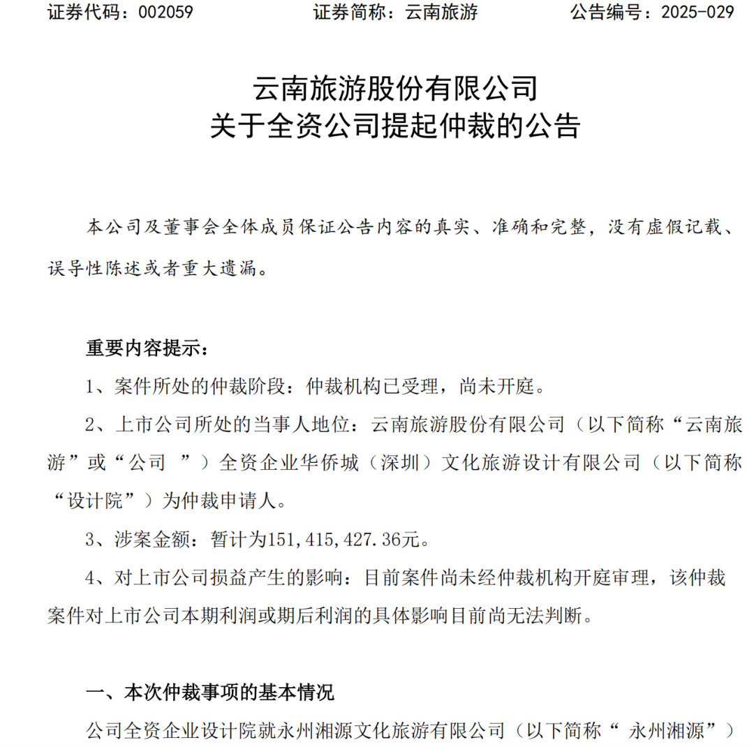 4月9日,文旅央企华侨城集团旗下上市公司云南旅游(SZ.002059)发布公告称,正在对永州湘源文化旅游有限公司(以下简称“永州湘源”) 未按照合同约定支付款项事宜向中国国际经济贸易仲裁委员会提起仲裁,涉案金额1.51亿元。