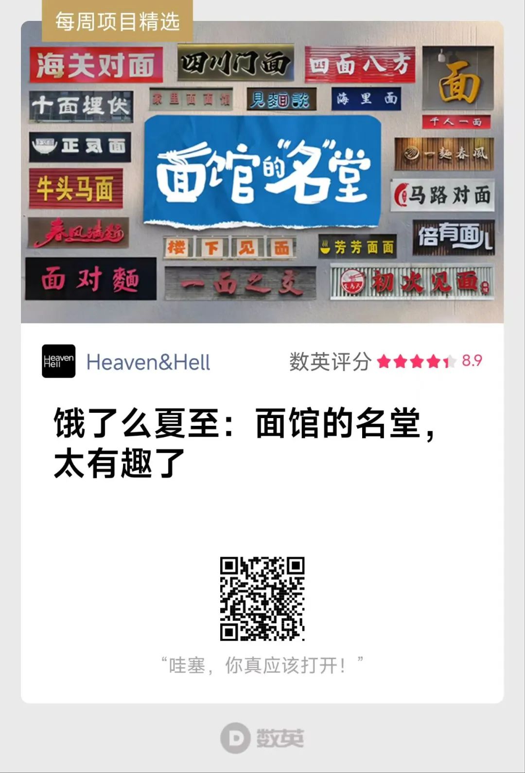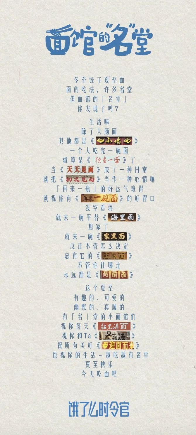 后来,饿了么找到Heaven&Hell,希望做一个夏至日的campaign。“节气”,依旧是一个相对宏大的命题,但金思涵找到了“一碗面”这个小切入点,并深挖出“一碗面”背后更小、更具体的东西——面馆的招牌。于是有了《面馆的“名”堂》,真实取材,真实故事,真实的生活,也收获了大众真实的喜欢。