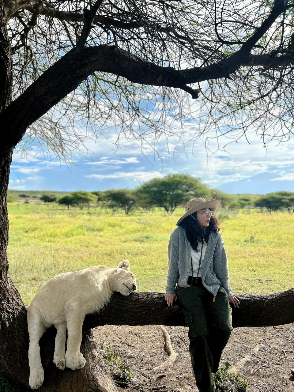 金思涵称,自己就是什么都想体验一下,她尝试各种球类运动、徒步,喜欢城市漫步,也喜欢远行探险,去年在坦桑尼亚,她坐在熟睡的狮子旁边,完成了人生清单之“撸大猫”。