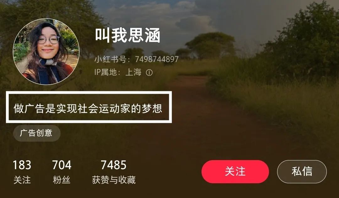 在金思涵的小红书账号,有这样一句简介:“做广告是实现社会运动家的梦想”。