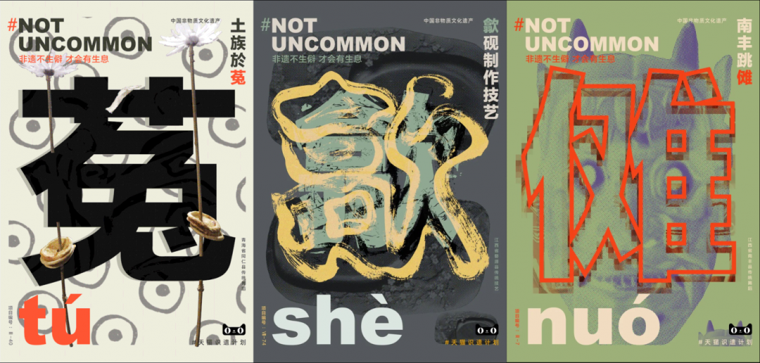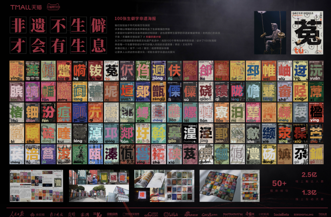 金思涵团队决定先解决宏观问题之下的“小”问题,于是有了#非遗不生僻 才会有生息#这个文案,他们找到了100个带有生僻字的非遗,结合海报、视频,联合品牌制作周边,将生僻字作为一种文化符号与非遗的文化内里相融合,达成了多个非遗文化知识的广泛传播,亦很好地兼顾了商业价值。