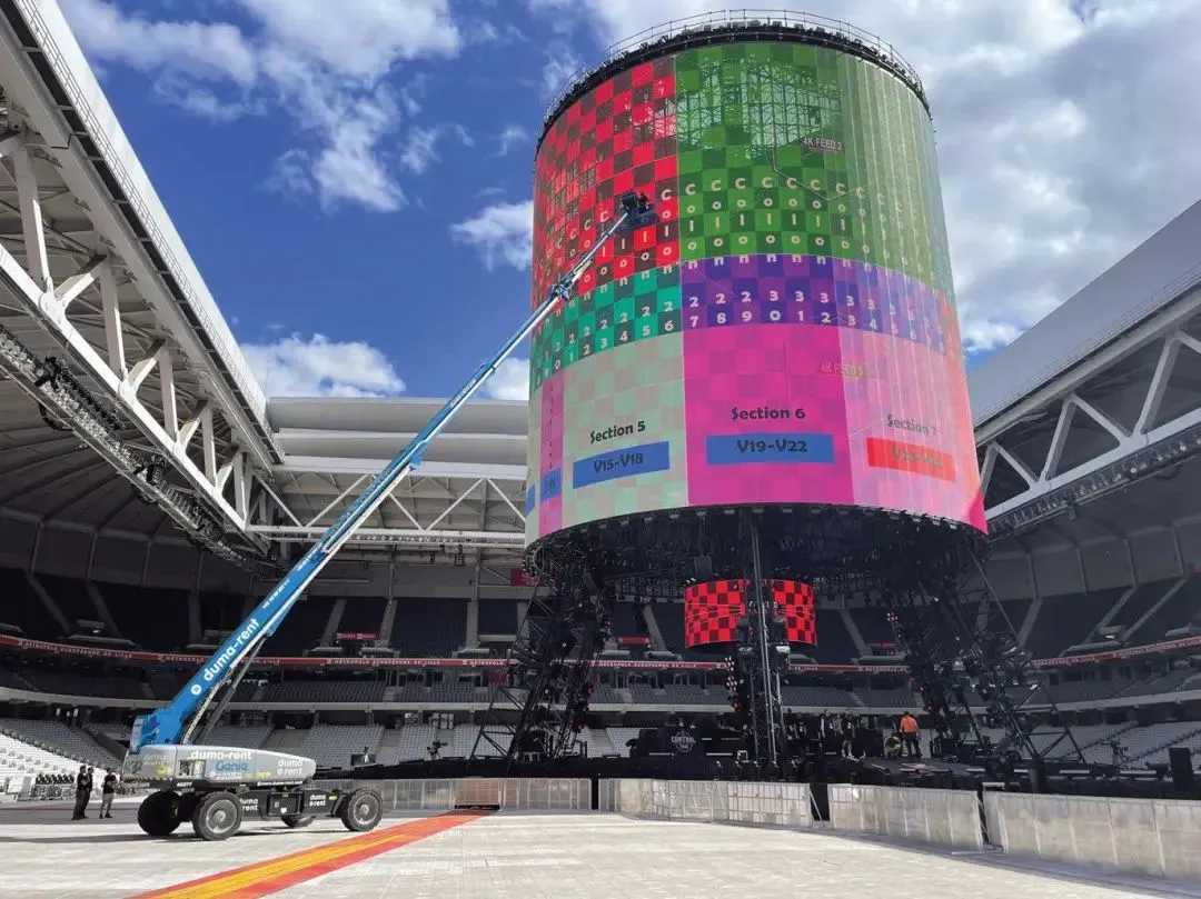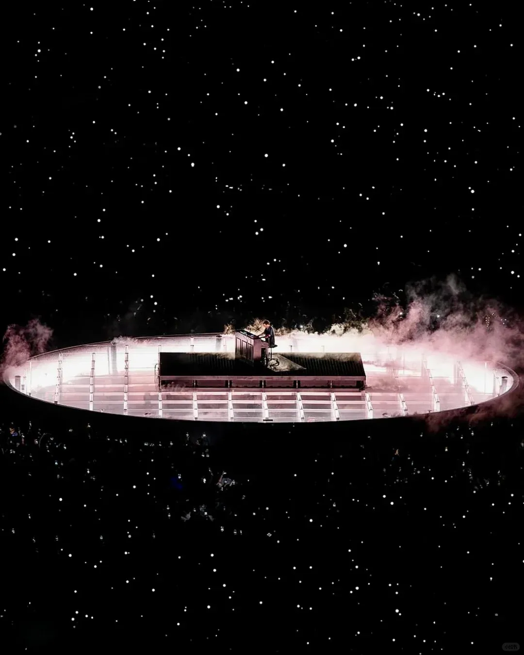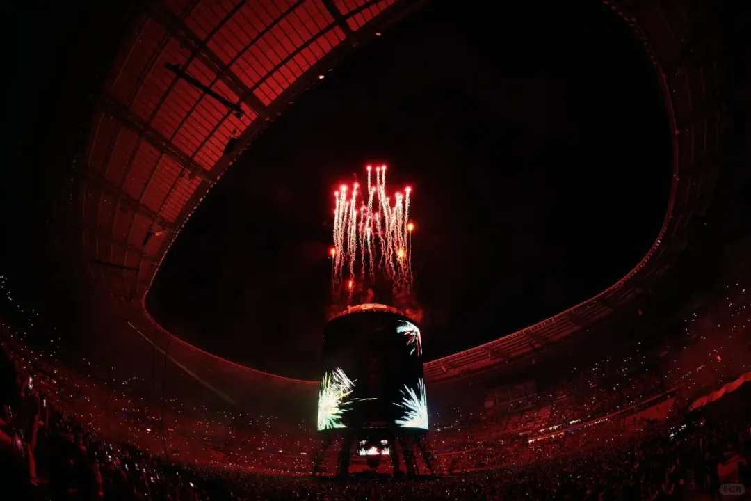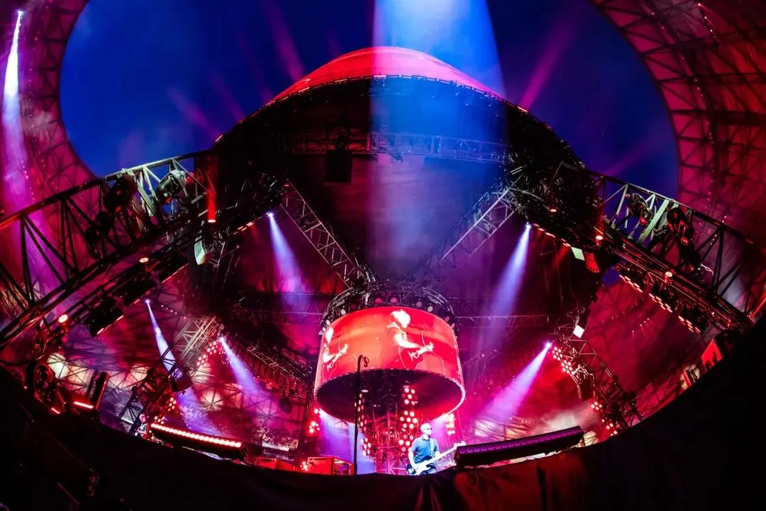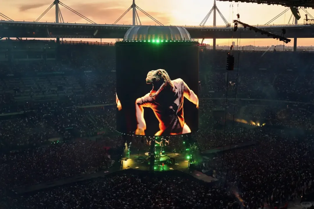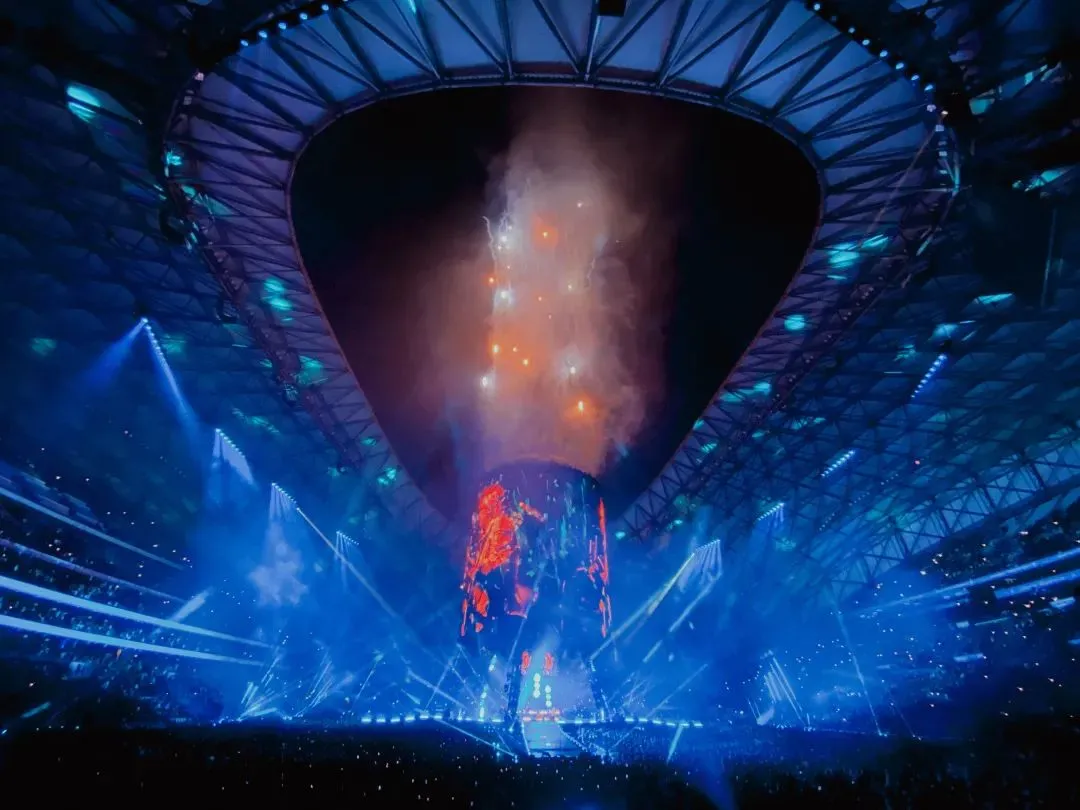 声场方面,舞台周围布置了 68 个三重 21 英寸低音扬声器,形成一个环形,以均匀覆盖整个场地,并且在半空中增加 21 个扬声器堆叠,最远的位置还配备了额外的低音扬声器,再配合PA,完成动听的声音配置。
