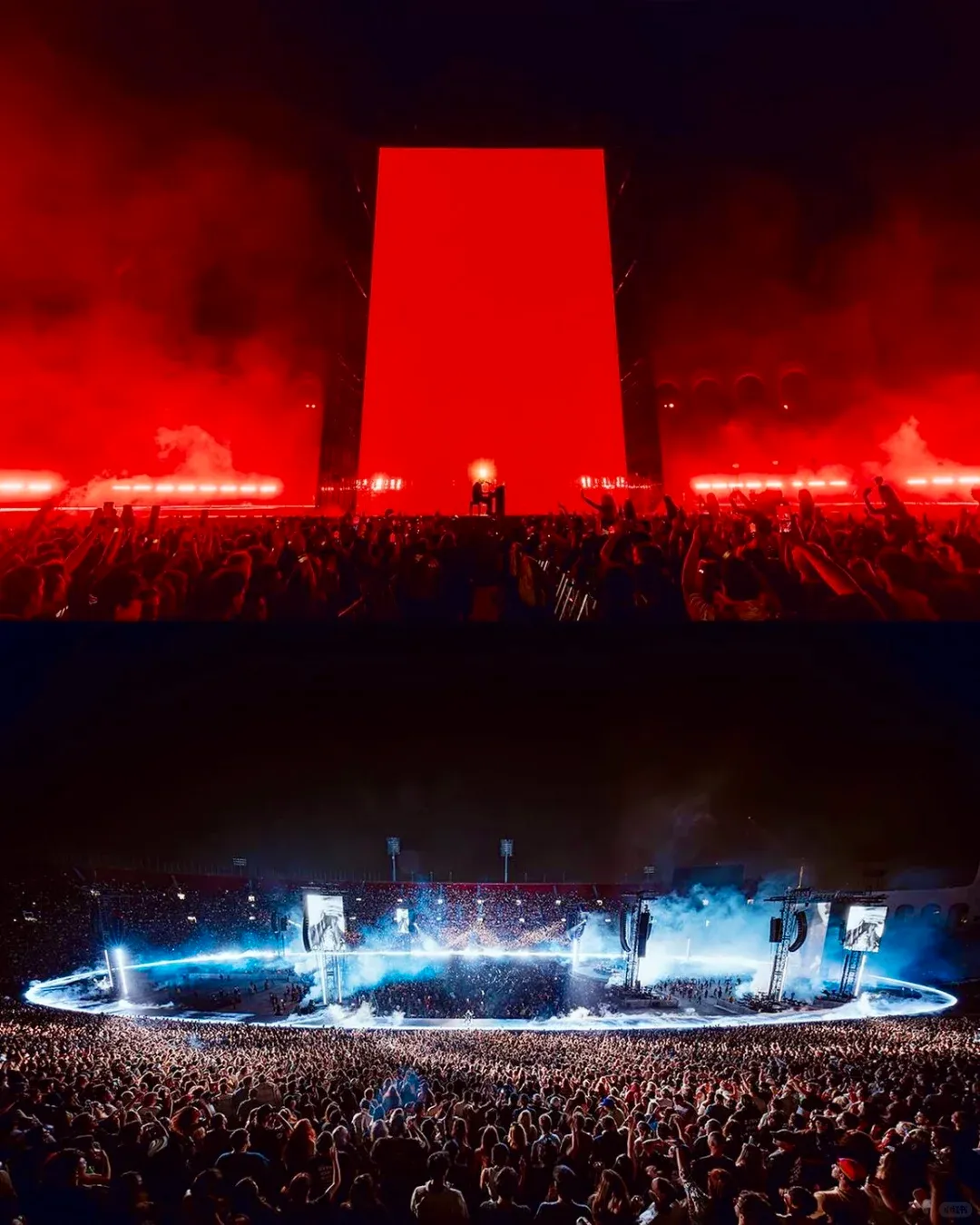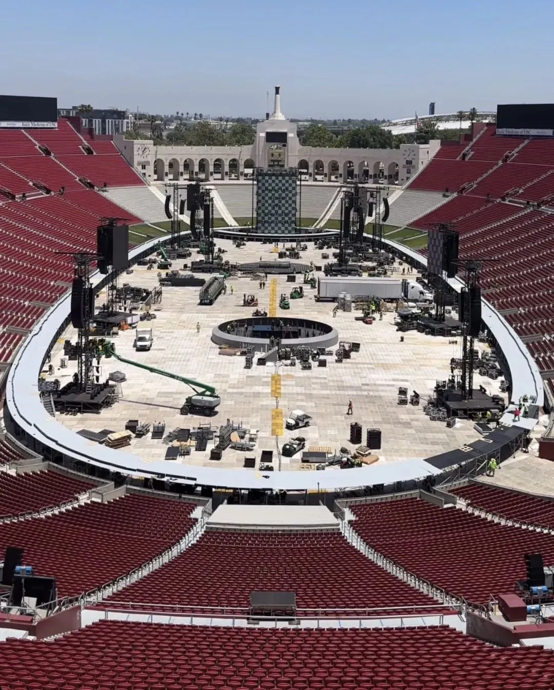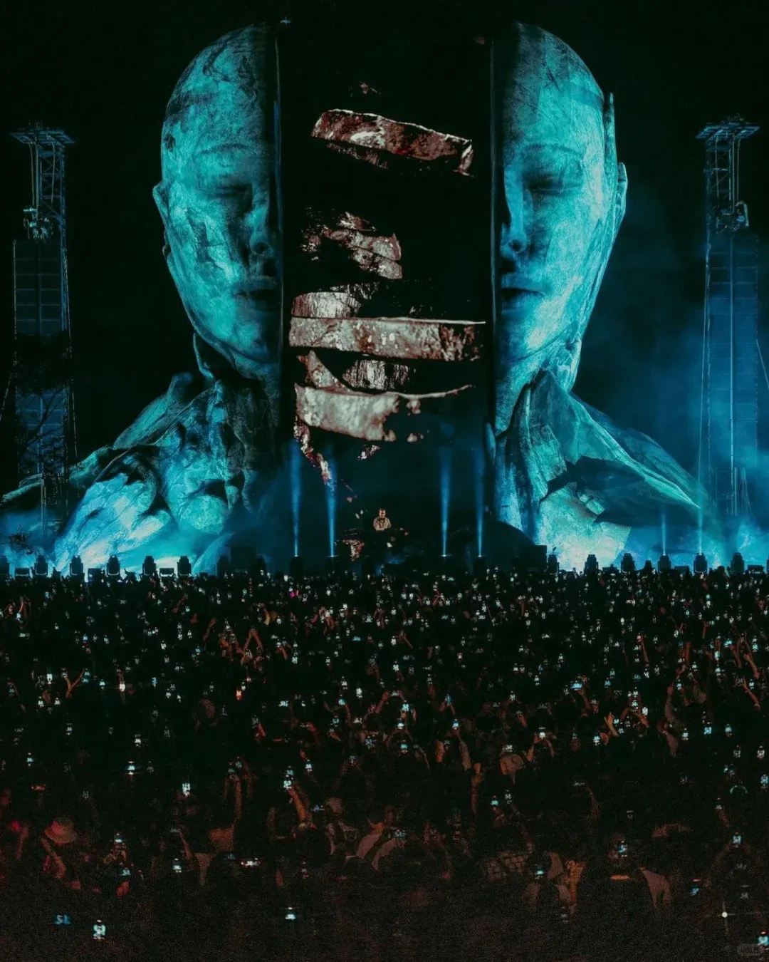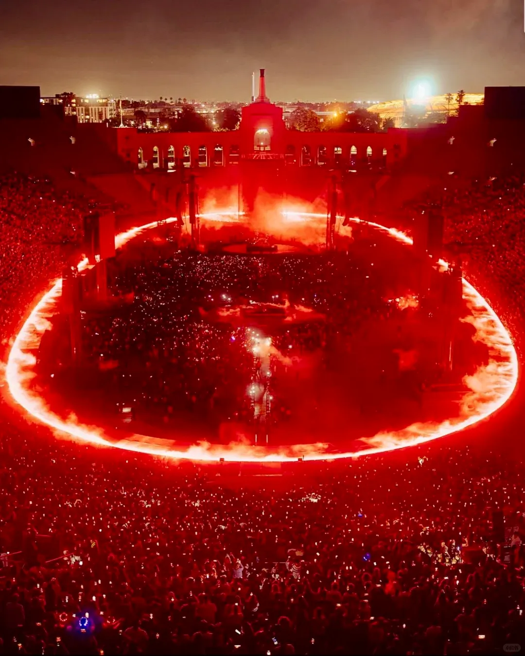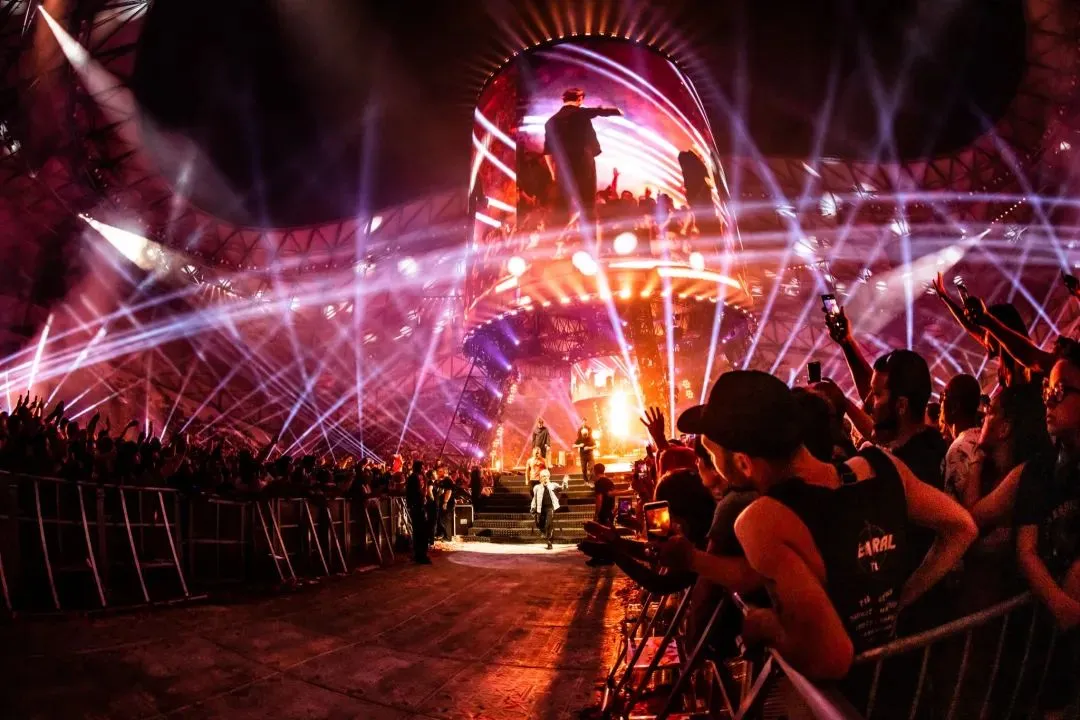 声场方面,舞台周围布置了 68 个三重 21 英寸低音扬声器,形成一个环形,以均匀覆盖整个场地,并且在半空中增加 21 个扬声器堆叠,最远的位置还配备了额外的低音扬声器,再配合PA,完成动听的声音配置。