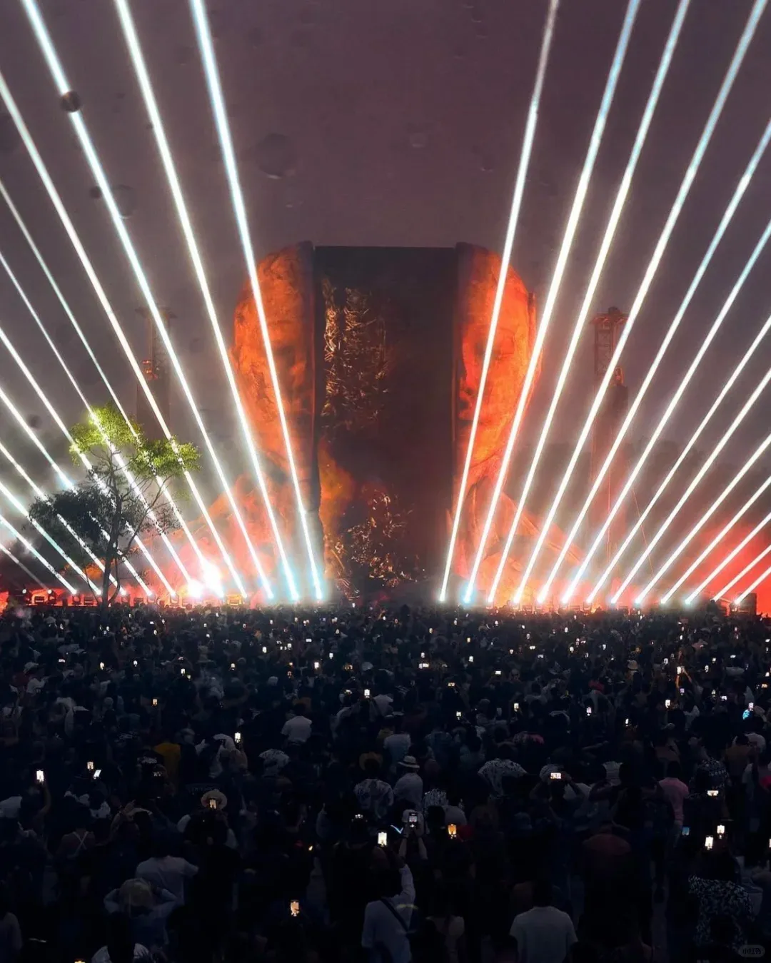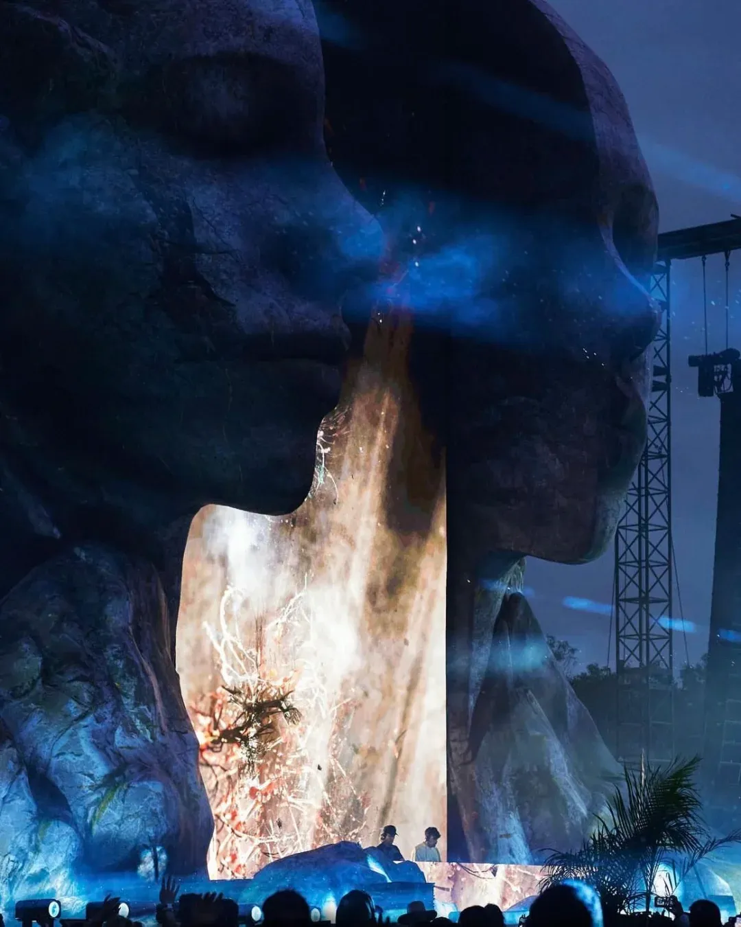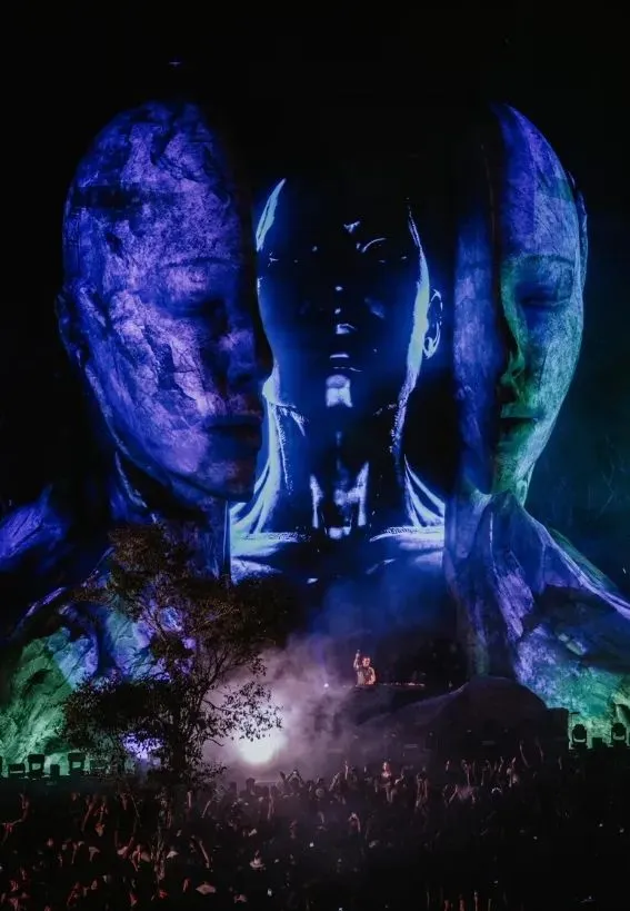 CORE Tulum的舞台设计中,巨大人头无疑是焦点:双目轻闭的巨大人头被一面长矩形大屏一分为二,仿佛屏幕上呈现的大观是从人脑中抽离出来的思维切片,安详而睿智的眉宇之间,似乎隐藏着对生命、艺术和宇宙奥秘的深邃领悟。整个头像造型模拟岩石材质,这与周围热带植物相互映衬,使整个舞台呈现出一种与自然融为一体的感觉。黎明破晓时,魔法在大自然的荣耀中继续。