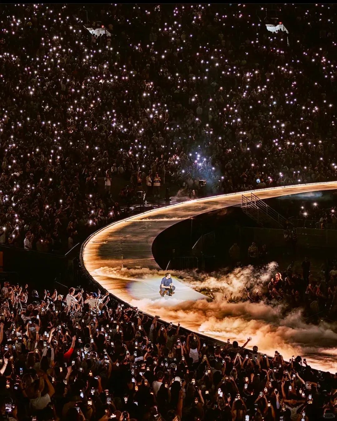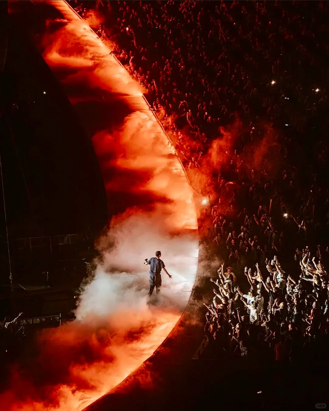 这是Fred Again 在洛杉矶体育场的首场体育场演出。为了在开阔露天的场地实现和粉丝近距离的互动和氛围,舞美的团队humanperson特别设计了一条“护城河”,它从主舞台延伸而出、环绕内场,形成一个独特的互动区域,让艺术家能与整场的观众紧密互动。护城河不仅是视觉上的亮点,更是连接舞台和观众的重要桥梁。Fred 的创意总监 Lucy Hickling说“能够确保制作围绕着每个人,每个人都能感受到演出的一部分,而不是仅仅观看演出,这一点很重要,”