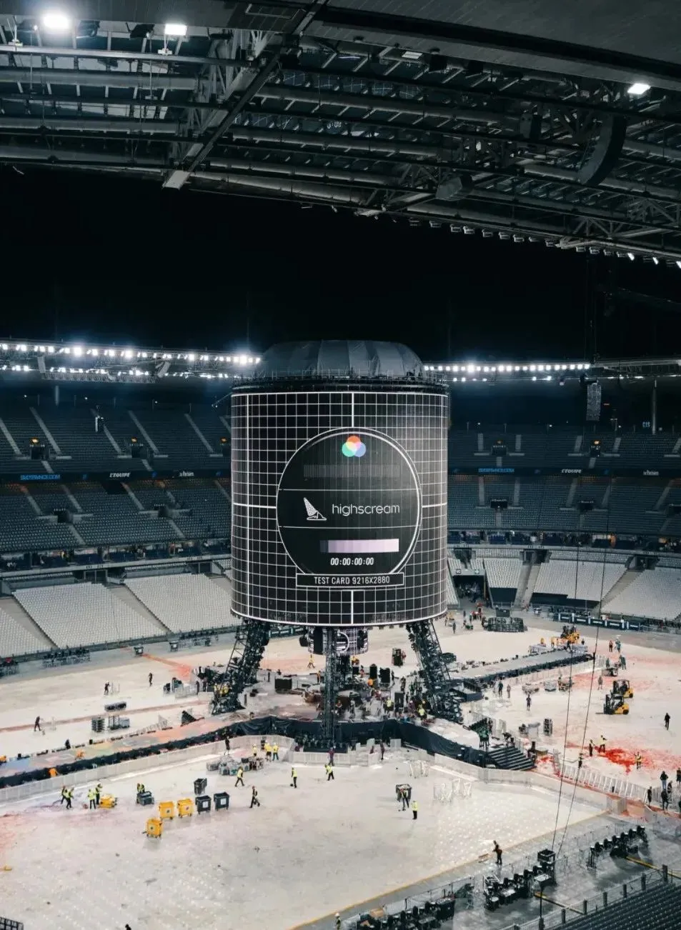 塔楼从设计到建造总共历时两年,为了实现这一构想,联合设计团队选择了特制的 Titan-X LED ,并配备了 PRG 最新创新的 SoundBlast和超过1360枚灯具组成的照明矩阵 。制作总监 Stéphane Desch 说道:“Nicola 想为所有粉丝提供难忘的体验。在体育场中间建造一座 360° 塔,里面有音频和照明,可以让每个人都看得更清楚,并沉浸在纯粹的音乐表演和艺术存在中。我们从他的草图开始,最终的结果非常接近他最初的设想。”整个舞台占地850平方米,整体高度达45米,重达258吨,其中钢结构就重达150吨。