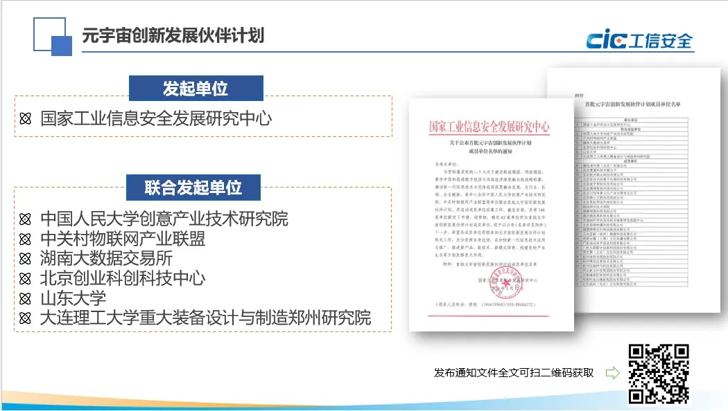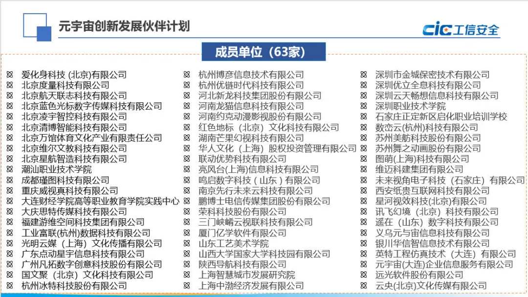 元宇宙创新发展伙伴计划由国家工业信息安全发展研究中心联合有关单位共同发起,旨在联合多方力量,汇集优势资源针对地方政府、产业园区、企业关于元宇宙、数字孪生等新一代信息技术发展的多元需求,围绕“元宇宙+工业”“元宇宙+现代服务业”等多行业领域打造元宇宙与实体经济融合创新发展的合作平台机制,促进元宇宙产业高质量发展。首批成员单位名单如下。