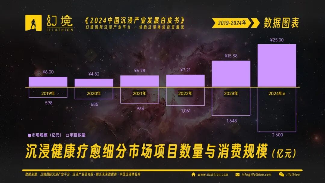 沉浸健康疗愈细分市场,特指以沉浸体验作为健康疗愈核心吸引或消费项目的消费市场。主要市场覆盖健身、运动、疗愈、养老四大领域,中国的热门沉浸健康疗愈业态包括:冥想、沉浸萌宠馆、沉浸疗愈、互动健身房、光影瑜伽、沉浸运动馆、沉浸SPA馆、睡眠音乐会、沉浸漂浮馆、沉浸解压馆、沉浸竞技场、沉浸盐洞和疗愈花园等。沉浸体验可以居于健康疗愈项目的核心,也可以是健康疗愈项目的辅助。