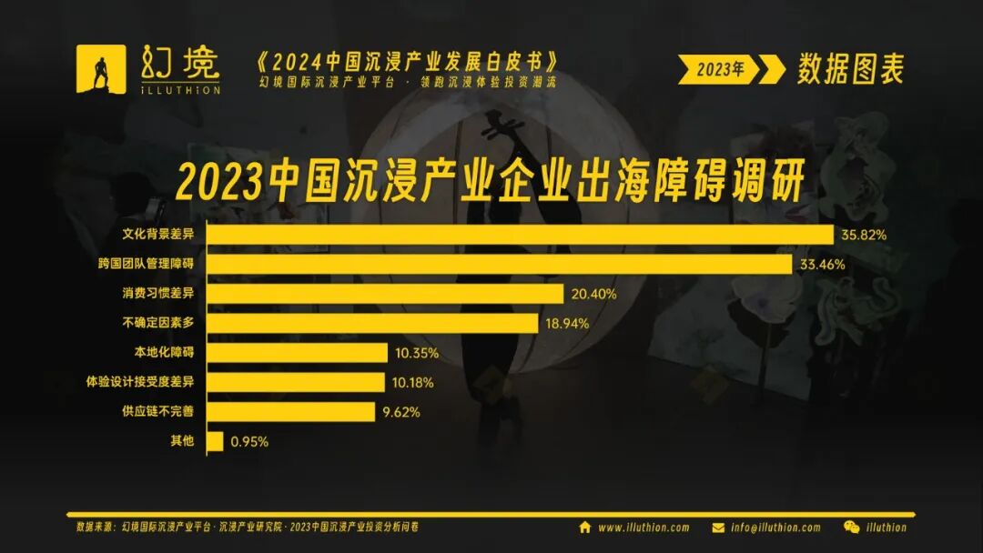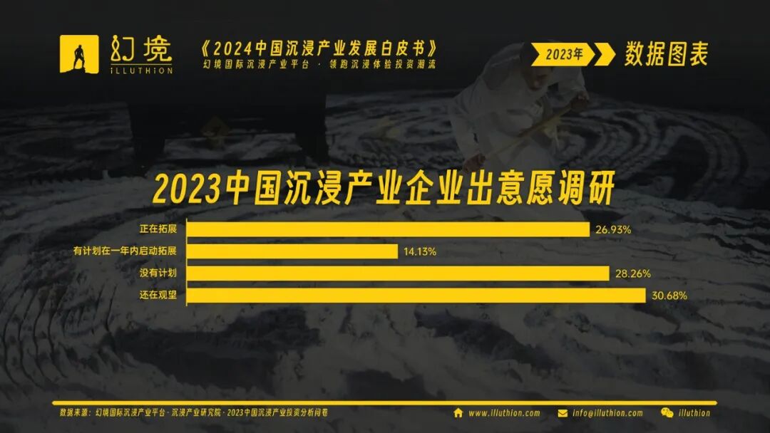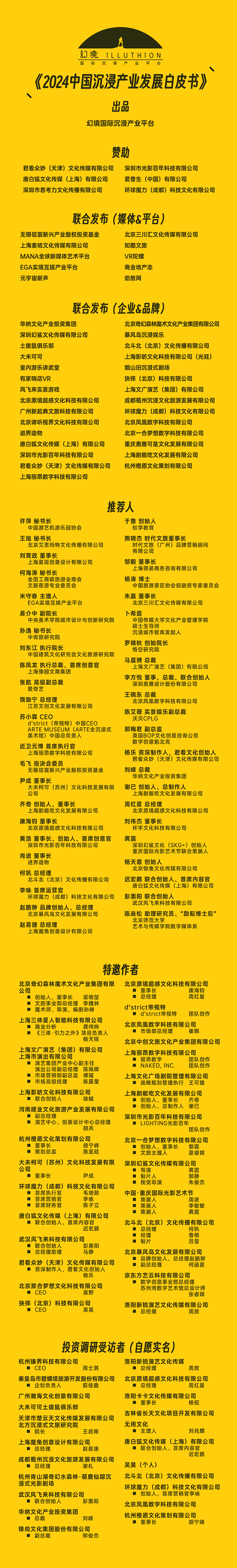 由于技术限制,中国沉浸体验库在沉浸扩展现实、沉浸公共空间、沉浸教育成长、沉浸互动影游和其他沉浸小众5个细分市场的数据可能不完整。因此,《2024中国沉浸产业发展白皮书》中的观点、图表及结论仅供参考,「幻境国际」不对其承担相应的法律责任。
