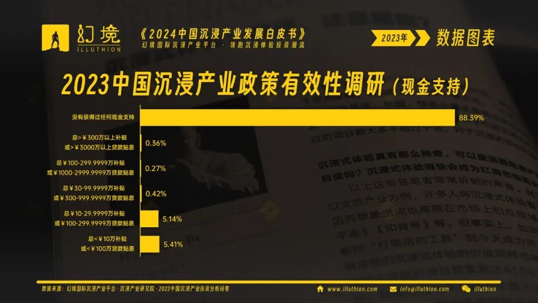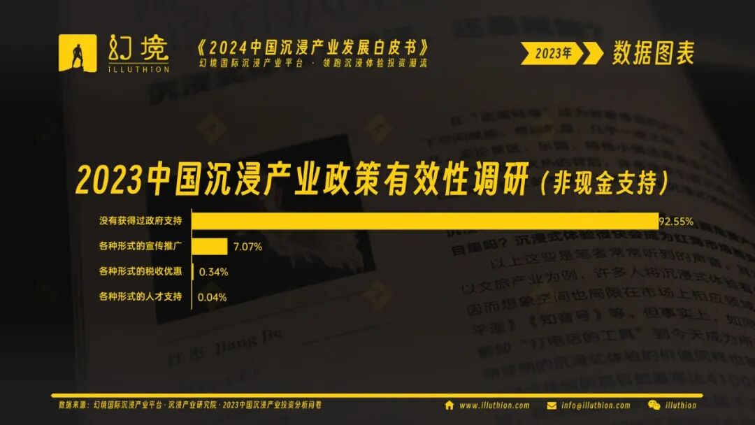 然而,现实中的情况显示,尽管头部企业在政策的推动下实现了一定的发展,但88.39%的企业表示从未获得过如直接补贴或银行贷款贴息等现金支持,92.59%的企业也未能享受到如宣传推广、税收优惠或人才支持等非现金扶持,仅有7.07%的企业得到了政府在宣传推广上的支持。中国沉浸产业企业尤其是民营企业,难以直接从产业政策中直接获益。