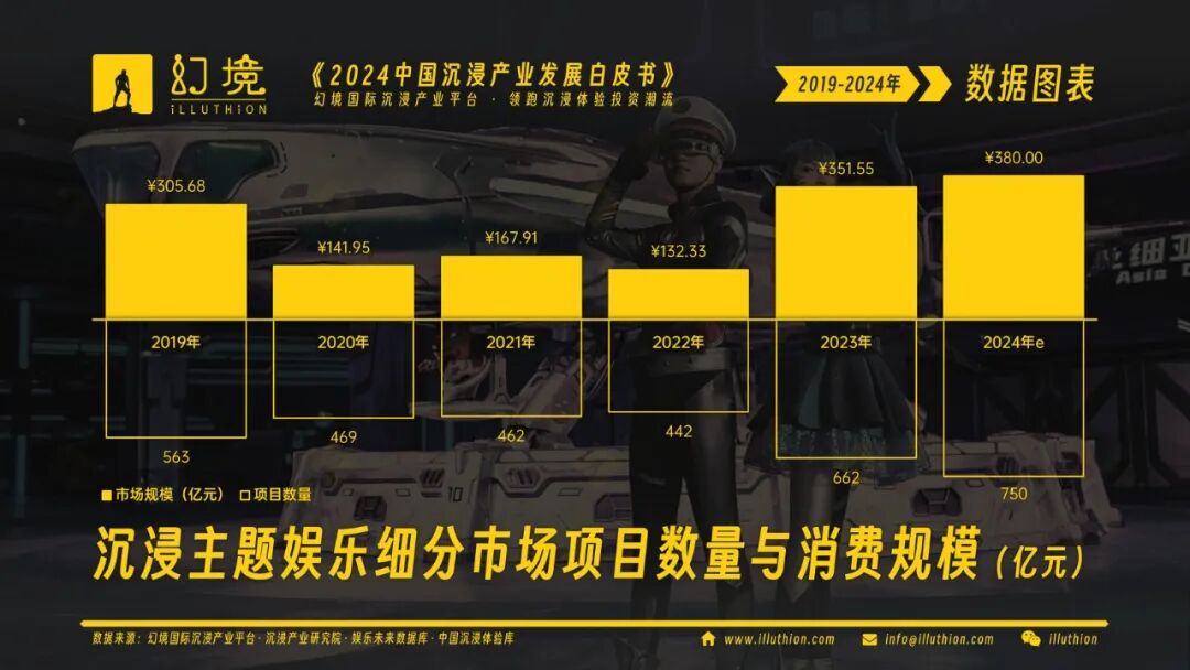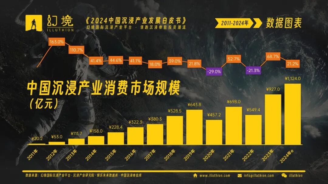 2023年,中国沉浸产业迎来了蓬勃发展,消费市场规模达到了927亿元,相比2019年的643.8亿元增长了44%,预计2024年将突破千亿大关达到1,124亿元。