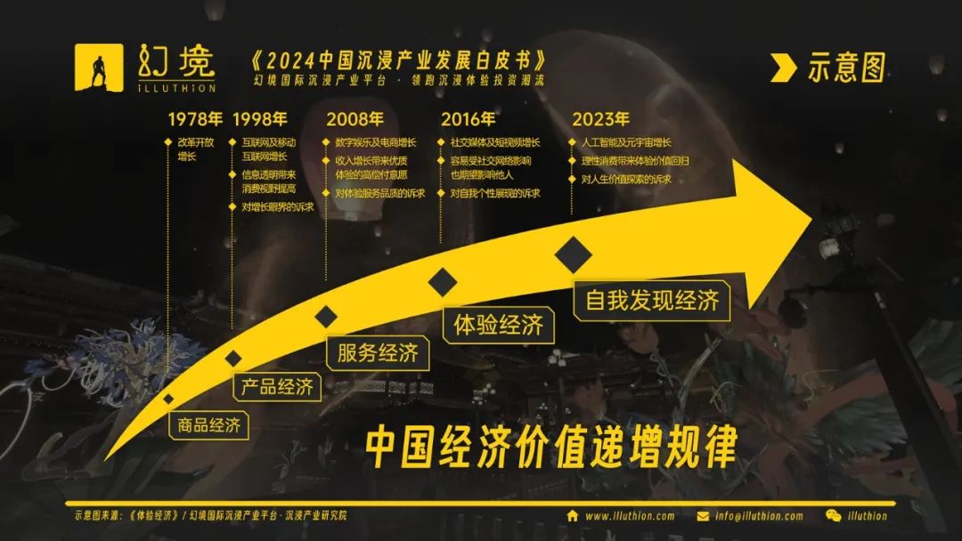 1998年,“体验经济”教父约瑟夫·派恩(B. Joseph Pine II)在著作《体验经济》(Experience Economy)中首次系统论述了“体验经济”概念,人类经济活动将从商品经济、产品经济、服务经济逐步进化到体验经济和自我发现经济,每次进化都伴随着全新消费需求的诞生。1978-2024年,甚至未来的中国经济发展,都符合这样的价值递增规律。沉浸体验将不可避免地成为贯穿体验经济和自我发现经济全生命周期的重要商业范式。无论我们选择以乐观或是悲观的视角看待中国当下与未来的发展,都必须重点关注体验经济和自我发现经济背后的演变生长逻辑。