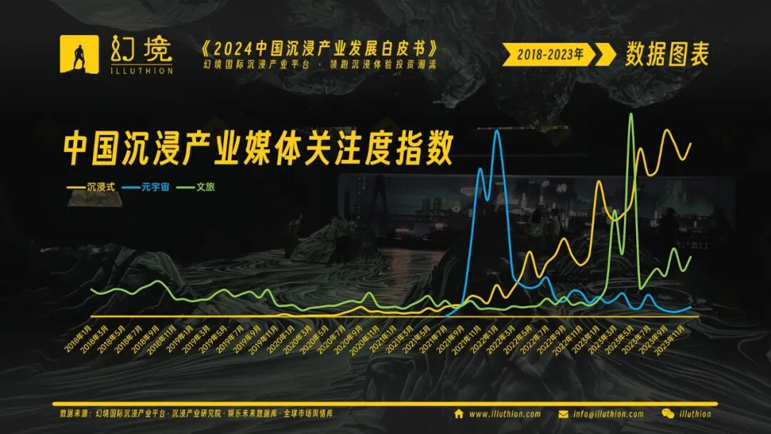 “中国沉浸产业媒体关注度”指数是「幻境国际沉浸产业平台」对“沉浸式”关键词在微信指数、百度指数和抖音指数(巨量引擎)的加权求和,代表了中国沉浸产业的热度。2019-2023年间,“中国沉浸产业媒体关注度”节节攀升,在很长一段时间内甚至超越了关键词“文旅”,成为了中国文化娱乐消费领域不可忽视的时代符号。