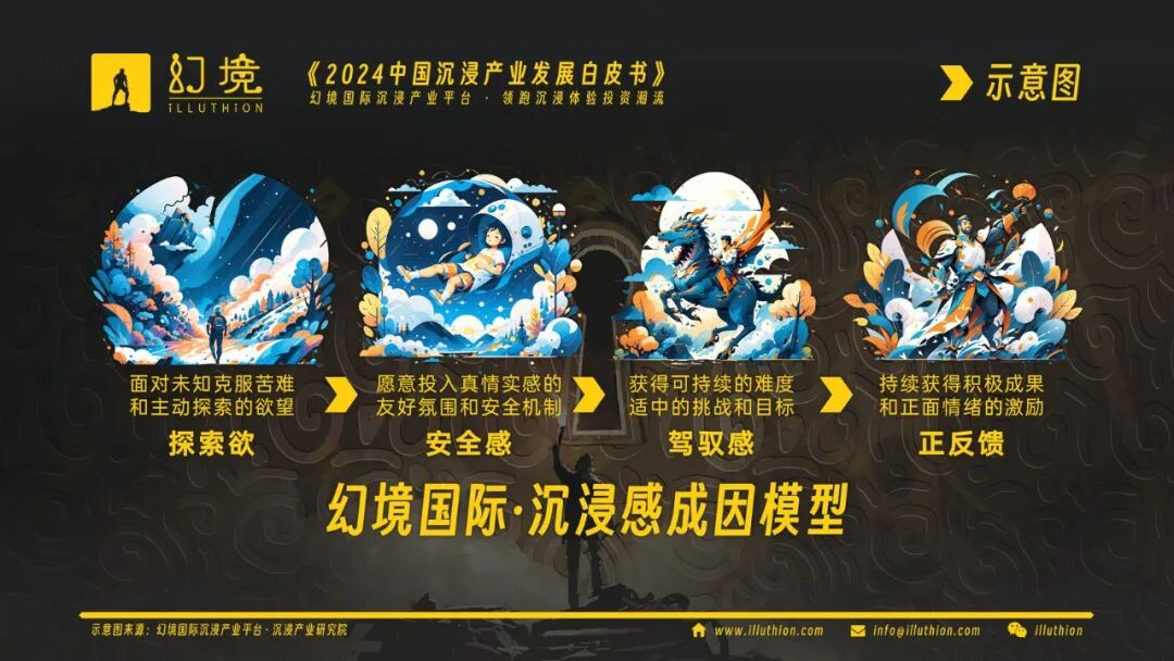 沉浸感的形成是一个神奇而复杂的过程,心理学家和神经科学家至今还在不断探索这个前沿领域的奥秘。「幻境国际沉浸产业平台」仅通过归纳现有沉浸体验的创制经验和科学成果,提出“幻境国际·沉浸感成因模型”,该模型包括四大要素:探索欲、安全感、驾驭感和正反馈,这些要素程度递进,相互作用,共同塑造出沉浸状态。
