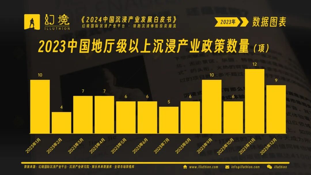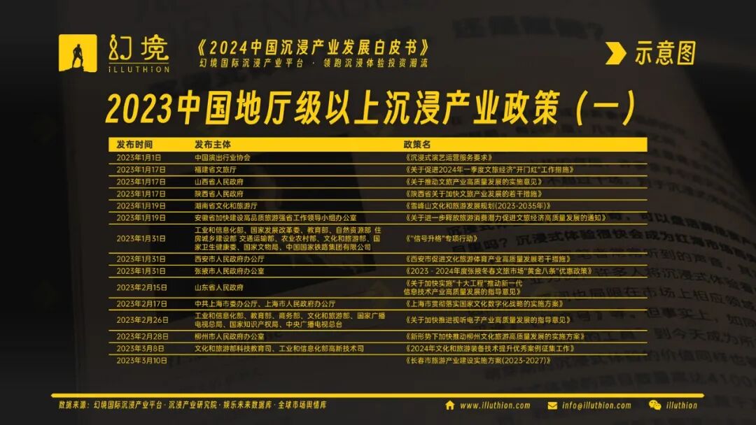 自2019年8月12日国务院办公厅发布《关于进一步激发文化和旅游消费潜力的意见》以来,中国沉浸产业在政策的支持下迎来了快速发展。随后文化和旅游部在2021年发布的《“十四五”文化和旅游发展规划》与《“十四五”文化产业发展规划》更是将“沉浸体验”定位为推动文化旅游行业高质量发展的核心要素。这样的顶层设计无疑为中国沉浸产业的创新与成长提供了前所未有的机遇。