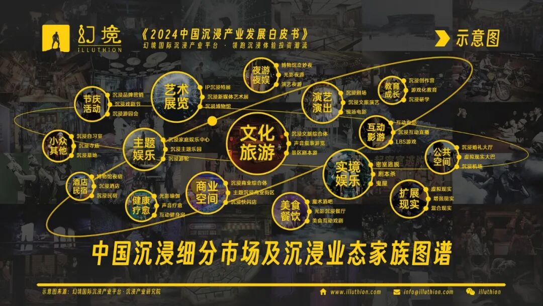 沉浸产业,也称为“沉浸式产业”或“沉浸式经济”,是一种新质产业形态,也是体验经济的王冠,兼具高度的经济价值和幸福价值。沉浸产业以沉浸体验产品为核心,以互动叙事、文化主题、空间营造、感官艺术、技术互动为生产要素,向消费者提供文化、人文、情感、情绪、审美、娱乐、成长、社交、幻想、逃避、自我展现和自我发现等体验价值。沉浸产业包含剧本杀、密室逃脱、沉浸演出、虚拟现实体验馆、沉浸换装体验馆、新媒体艺术展、沉浸冥想、光影艺术展、自拍艺术馆、沉浸室内主题乐园、沉浸旅游演艺、沉浸特展、情境景区等数百种代表性沉浸业态,覆盖沉浸文化旅游、沉浸主题娱乐、沉浸实境娱乐、沉浸演艺演出、沉浸艺术展览、沉浸扩展现实、沉浸商业空间、沉浸美食餐饮、沉浸节庆活动、沉浸夜游夜娱、沉浸健康疗愈、沉浸教育成长、沉浸互动影游、沉浸酒店民宿、沉浸公共空间和其他沉浸小众等16个细分市场。