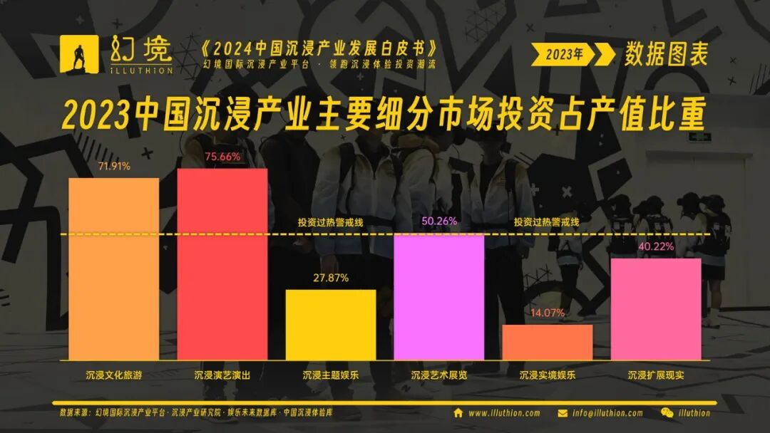虽然这种高速发展带来了中国沉浸产业投资的繁荣景象,但我们也必须警觉背后泡沫的产生。沉浸文化旅游和沉浸演艺演出的投资总额占产值比重均超了70%,远高于40%的健康线和50%的过热预警线。未来这些领域可能会面临产能过剩和消费泡沫的风险。「幻境国际沉浸产业平台」呼吁中国沉浸产业投资者理性投资,同时重视产业的可持续发展,投小、投新、投价值,勿跟、勿卷、勿上头。