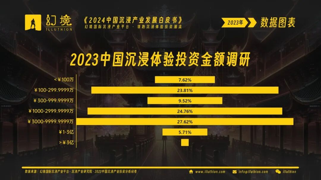 - 2023中国沉浸产业投资分析问卷:针对中国沉浸产业投资者发放的问卷调研,共收到105份有效问卷。调研结果中,项目投资额度小于300万元的项目占比31.43%,投资额介于300万元-3,000万元之间的项目占比34.28%,投资额大于3,000万元的项目占比34.29%,相较于2023年中国沉浸产业项目在这三个投资区间的实际比例95.45%,3.8%,0.75%,调研样本呈现出了头部化和高投资额的特点。因此在数据分析中,「幻境国际」按对应比例降低了投资额介于300万元-3,000万元,和大于3,000万元项目的数据权重。