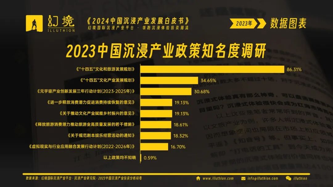 在沉浸产业的蓬勃发展中,政策的风向标不断为中国的从业者指明方向。「幻境国际沉浸产业平台」的《2023中国沉浸产业投资分析问卷》调研清晰地反映了这一点:《“十四五”文化和旅游发展规划》在沉浸产业从业者中的知名度极高,达到了86.31%。接着,不可忽视的《“十四五”文化产业发展规划》及《元宇宙产业创新发展三年行动计划(2023-2025年)》也分别拥有超过30%的认知度。即便是更为细分或冷门的政策,知名度也普遍保持在15-20%的区间,这凸显了从业者对当前“政策红利期”的广泛认识。